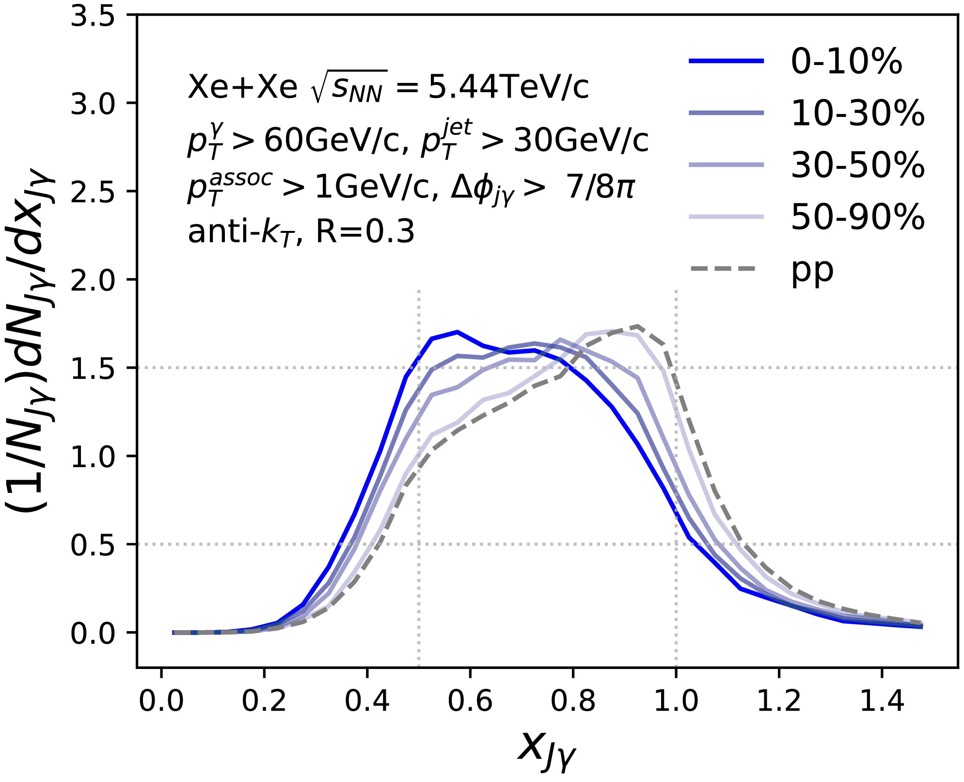 $ X_{J\gamma} $ in Xe+Xe collisions across different centrality intervals, as shown in Fig. 9. Our calculations demonstrate that central collisions exhibit the most significant shift in the$ X_{J\gamma} $ distribution toward lower values compared with p+p collisions, which reflects the strongest jet quenching effect. The magnitude of this shift diminishes in peripheral Xe+Xe collisions, consistent with reduced quenching strength in smaller collision systems. Notably, within equivalent centrality intervals, the$ X_{J\gamma} $ distribution in Xe+Xe collisions shows less pronounced leftward shifting than that observed in Pb+Pb collisions. This systematic difference indicates comparatively weaker jet quenching in Xe+Xe systems, which is consistent with their smaller geometrical size relative to Pb+Pb collisions. We note that, in this section, apart from the results presented in Fig. 3 and Fig. 7, all other results can, in principle, serve as experimental observables. -