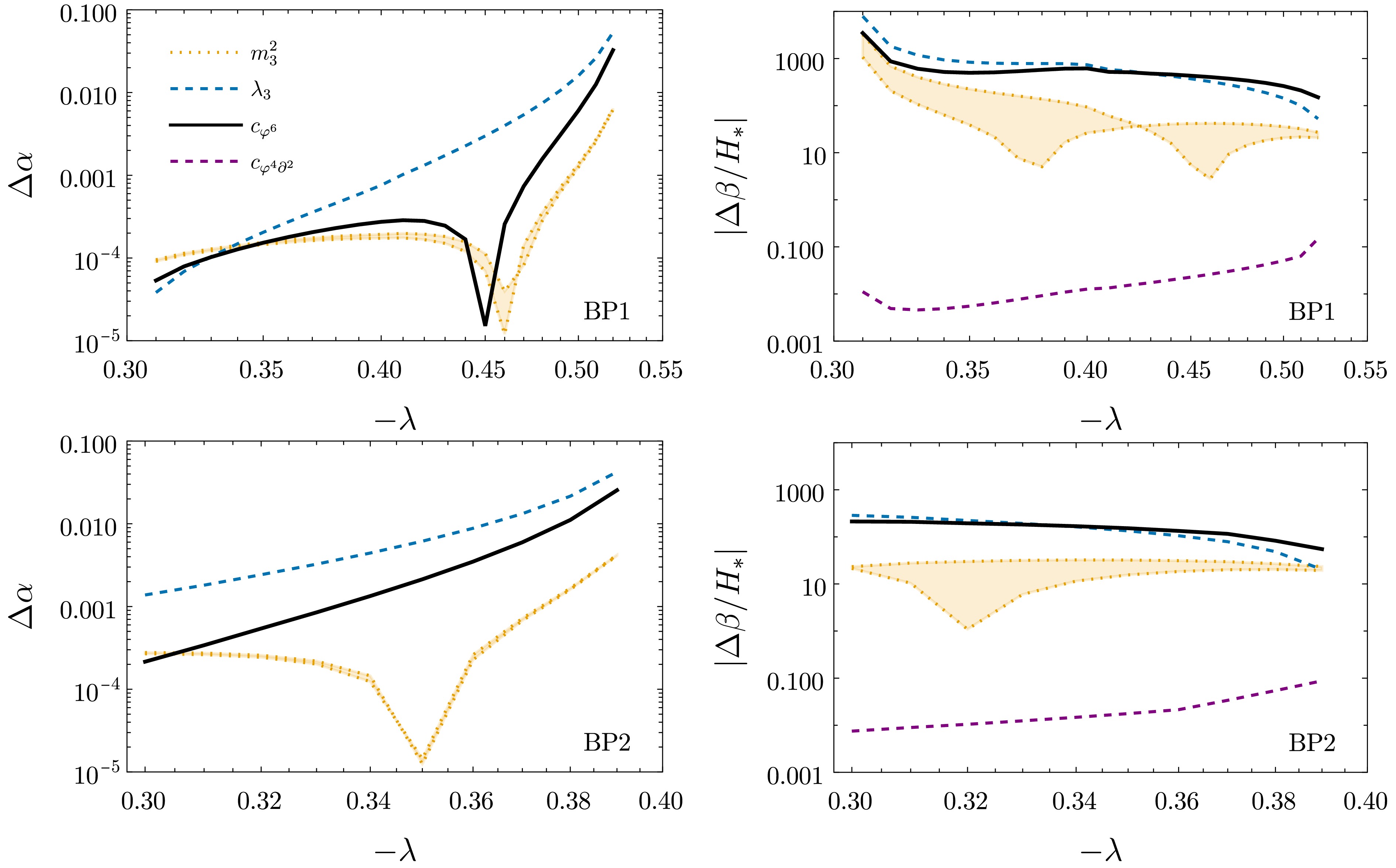 $ \lambda^2 $ , which in particular neglects effective interactions, we show α and$ \beta/H_* $ in Fig. 3.$ T_* $ varies much less, ranging from$ \sim 0.3 (0.2) $ to$ 0.15 (0.1) $ for BP1 (BP2).3 Regarding$ {\cal{O}}(\lambda^3) $ corrections, since our principal goal is to clarify the relative size of 1-loop effects of 3D effective operators versus 2-loop and 3-loop corrections to the mass and quartic coupling, in Fig. 4, we compare only the$ {\cal{O}}(\lambda^3) $ contributions to the above PT parameters.4