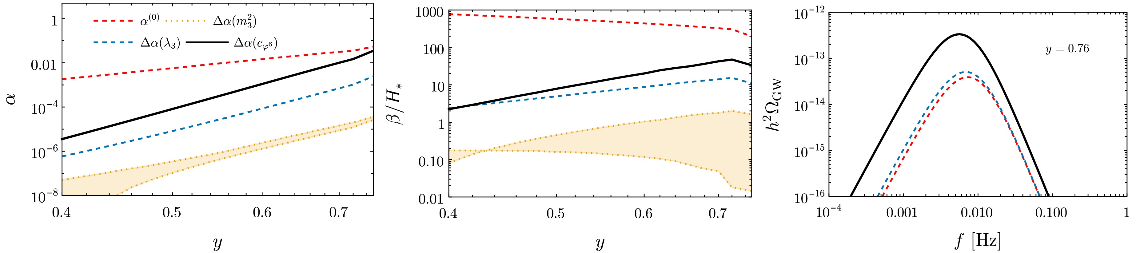 $ {\cal{O}}(1) $ Yukawa coupling. For fixed λ, we characterize the parameter space of the model in terms of the physical squared mass ($ m_P^2 $ ) and vacuum expectation value ($ v_P $ ) of ϕ at zero temperature:$ m^2 = \frac{1}{4} (-m_P^2-2 \lambda v_P^2)\,,\quad \frac{c_{\phi^6}}{\Lambda^2} = \frac{1}{3 v_P^4} (m_P^2-2\lambda v_P^2)\,. $