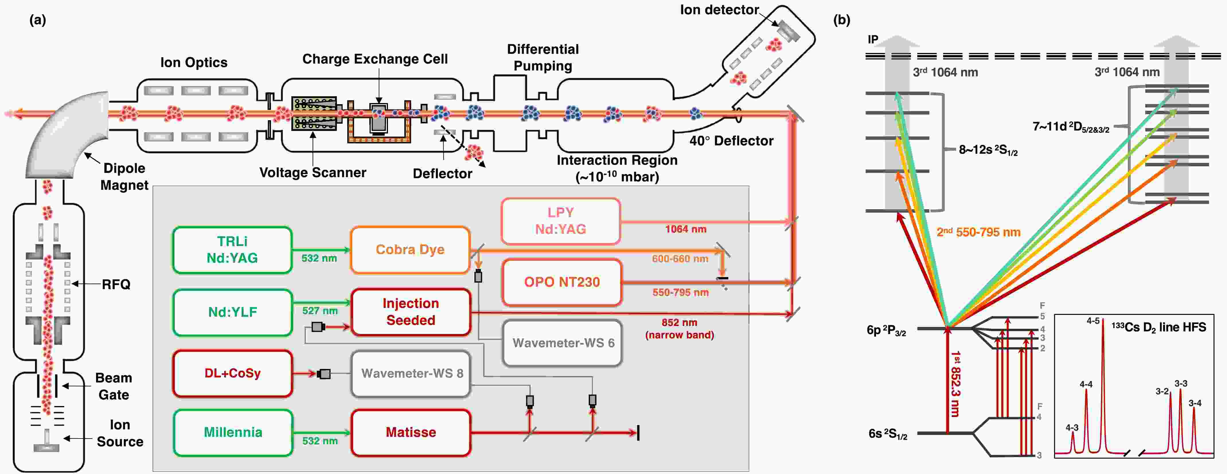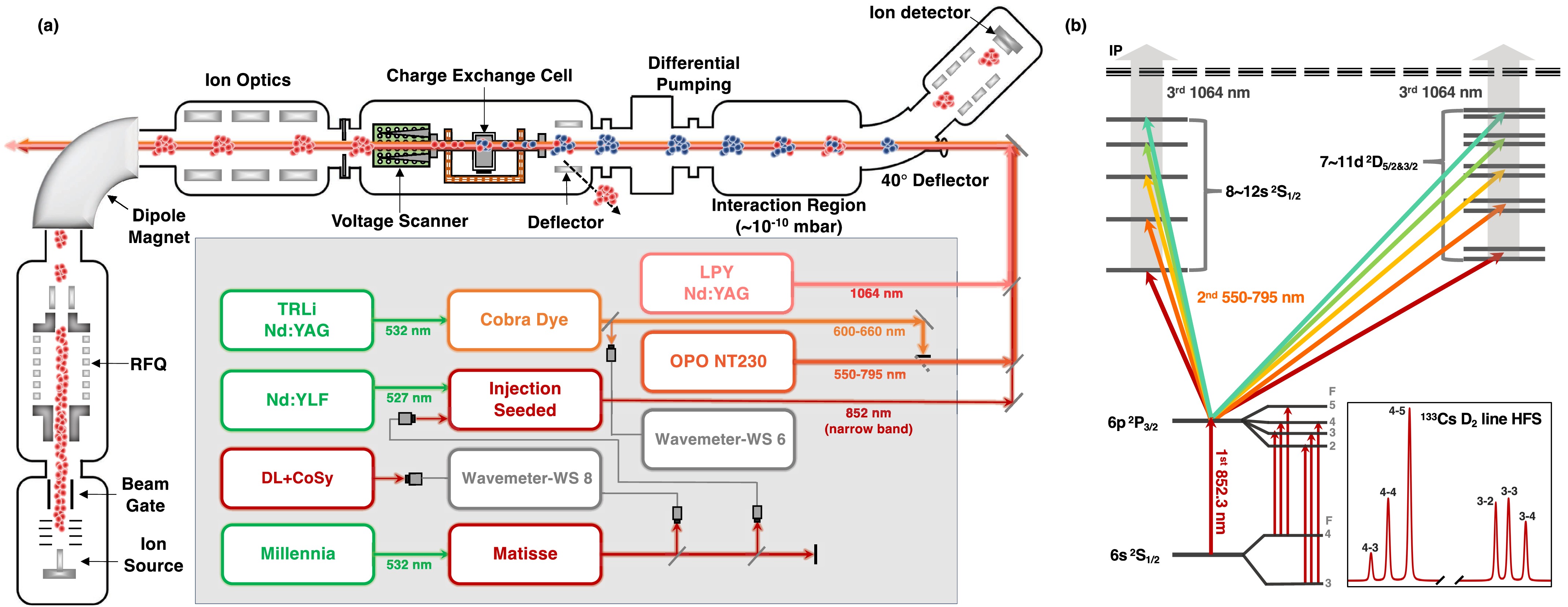 Figure 1. (color online) (a) A schematic view of the entire experimental setup and laser systems used for study work. (b) Resonance ionization schemes of Cs I being tested in this study.