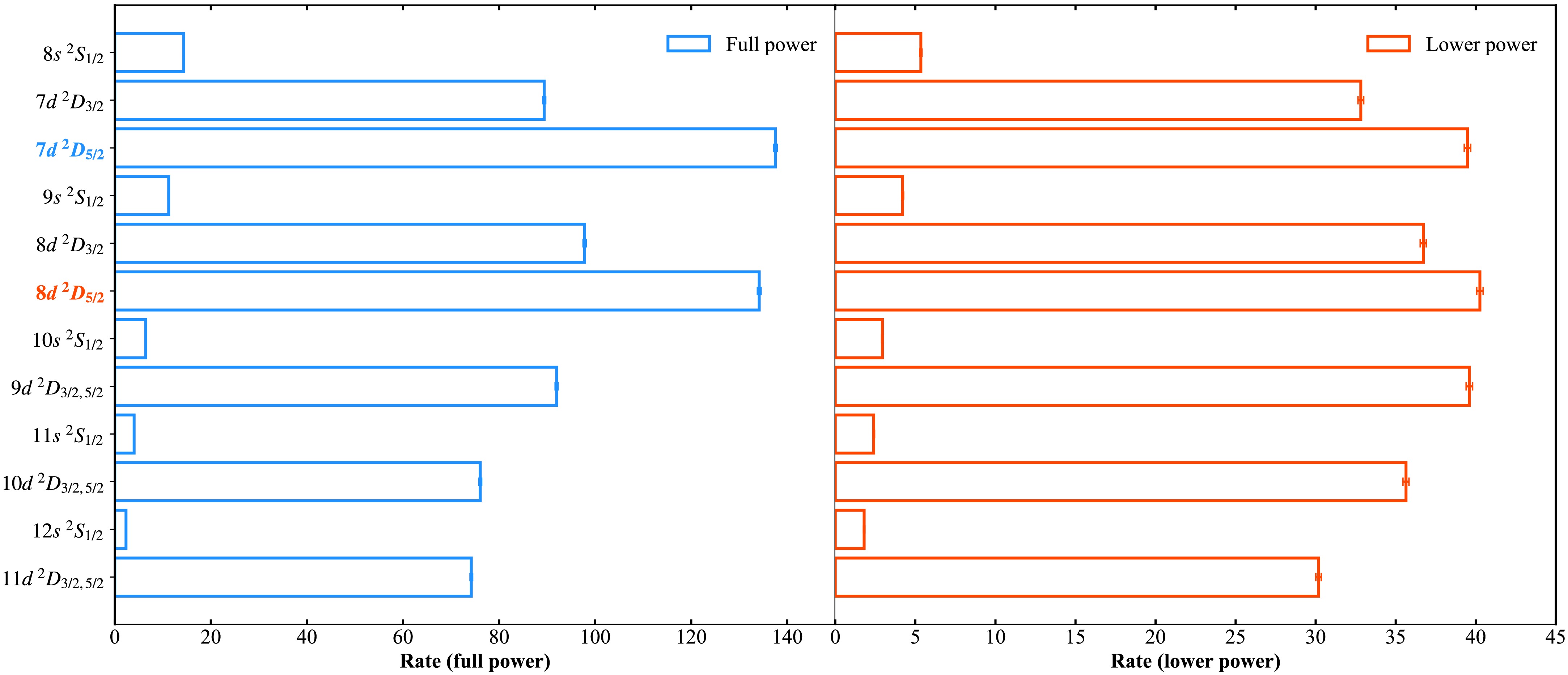 Figure 2. (color online) RIS count rate for different upper state of the second-step transition, obtained on the condition of the first-step laser at full power (left panel: blue) and at a reduced power (right panel: red). The states used for achieving the highest efficiency are highlighted in bold and with the corresponding color.