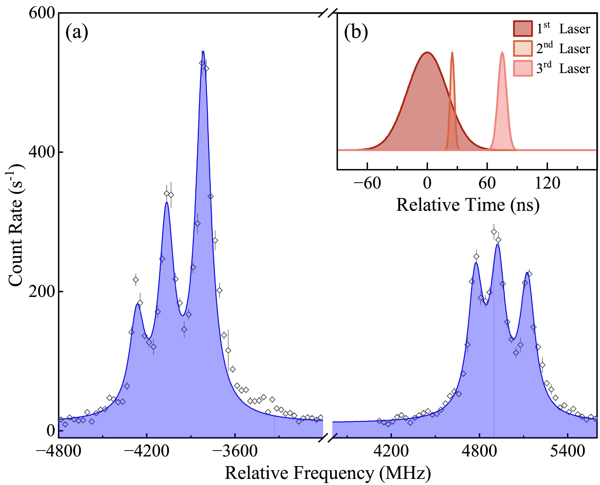 Figure 3. (color online) (a) HFS spectrum of 133Cs obtained with an efficiency of 1: 400 and a resolution of ~100 MHz (FWHM). (b) The optimized timing sequences of the three-step laser pulses. See text for further details.