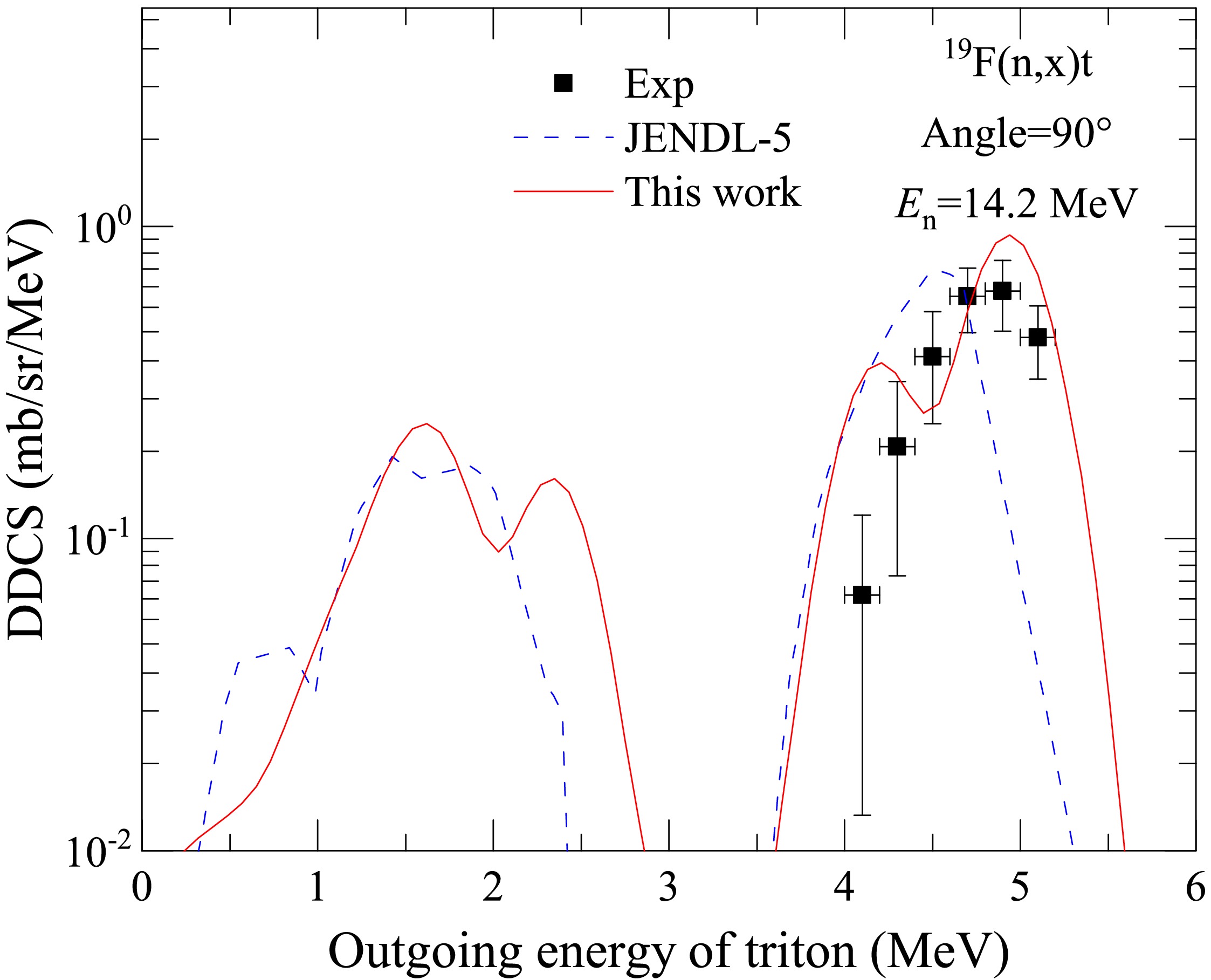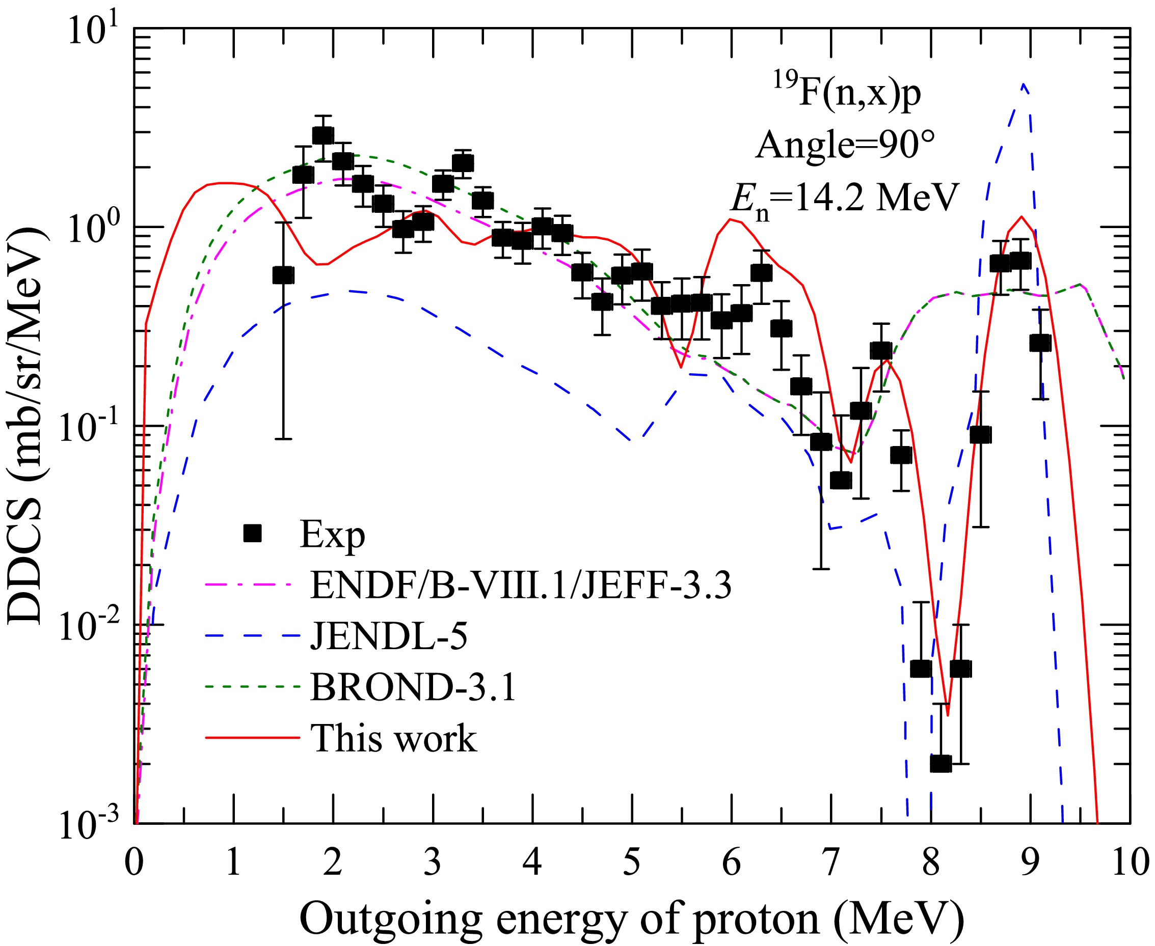 $ ^{19}\text{F}(n, \gamma $ )$ ^{20}\text{F} $ and$ ^{19}\text{F}(n, p)^{19}\text{O} $ within high density neutron-rich environments, which include scenarios such as supernova explosions and neutron star mergers. These reactions have significant implications for understanding element synthesis processes in nuclear astrophysics and elucidating cosmic nucleosynthesis mechanisms [1, 2]. In nuclear engineering and technology, physical quantities (such as cross section, angular distribution, and double-differential cross section (DDCS)) for the n+19F reaction play a critical role in key areas, including the nuclear fuel cycle, nuclear waste management, and nuclear safety systems. For example, fluoride molten salt serves as both the coolant and fuel carrier in nuclear reactors, enabling the extraction, purification, recovery, and recycling of valuable nuclides, such as uranium and plutonium. This facilitates efficient nuclear fuel production and reprocessing while enhancing reactor safety and economic performance [3−7].The DDCS is crucial for coupling energy and angular distributions of emitted particles, providing a concurrent description of neutron scattering and particle emission, handling numerous open reaction channels, and offering accurate distributions for particle transport, heat deposition, or radiation damage calculations [8]. Notably, the DDCS of outgoing charged particles is a fundamental value to estimate nuclear heating and material damages in fusion reactors [9]. Quantitatively describing the DDCS for neutron-induced light nucleus reactions is a challenging problem, not only due to the complexities of the reaction mechanisms but also the scarcity of data on the experimental DDCS of emitted charged particles. As the first nuclide in the 2s1d-shell,