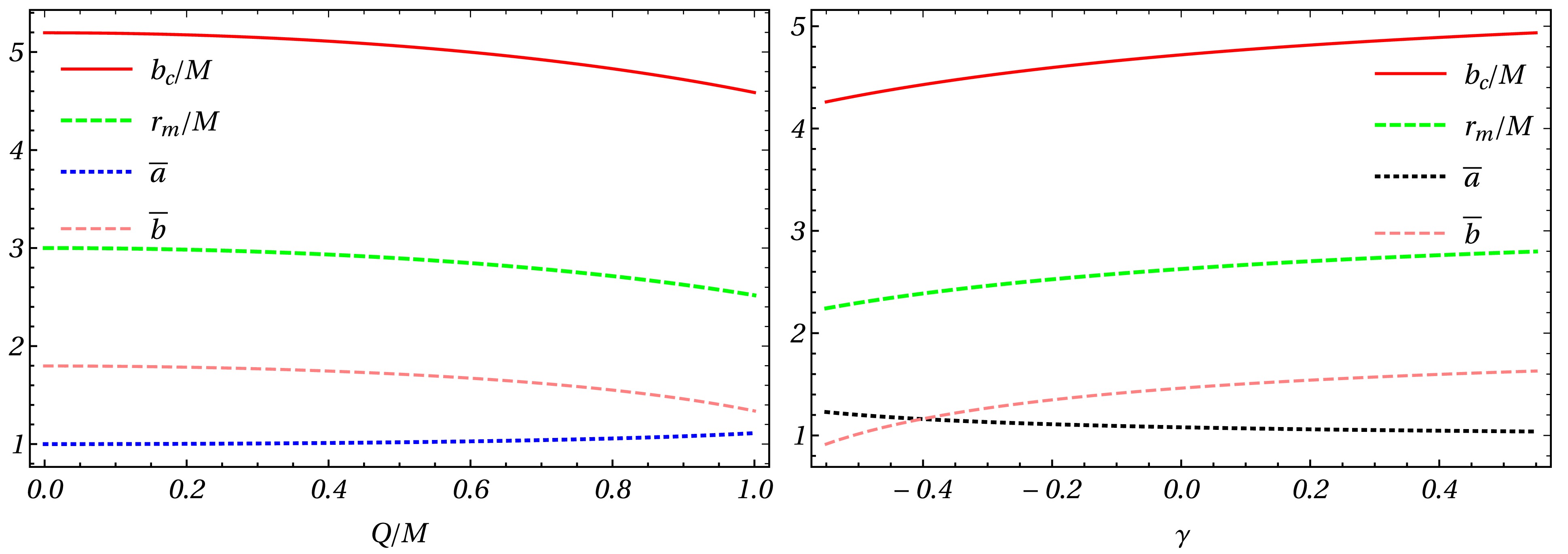 $ \overline{a} $ ,$ \overline{b} $ and the critical impact parameter$ b_c/R $ for Dyonic ModMax Black hole Spacetime. The values for$ Q/M=0 $ and$ \gamma=0 $ correspond to a Schwarzschild black hole.Figure 1. (color online) Quantities