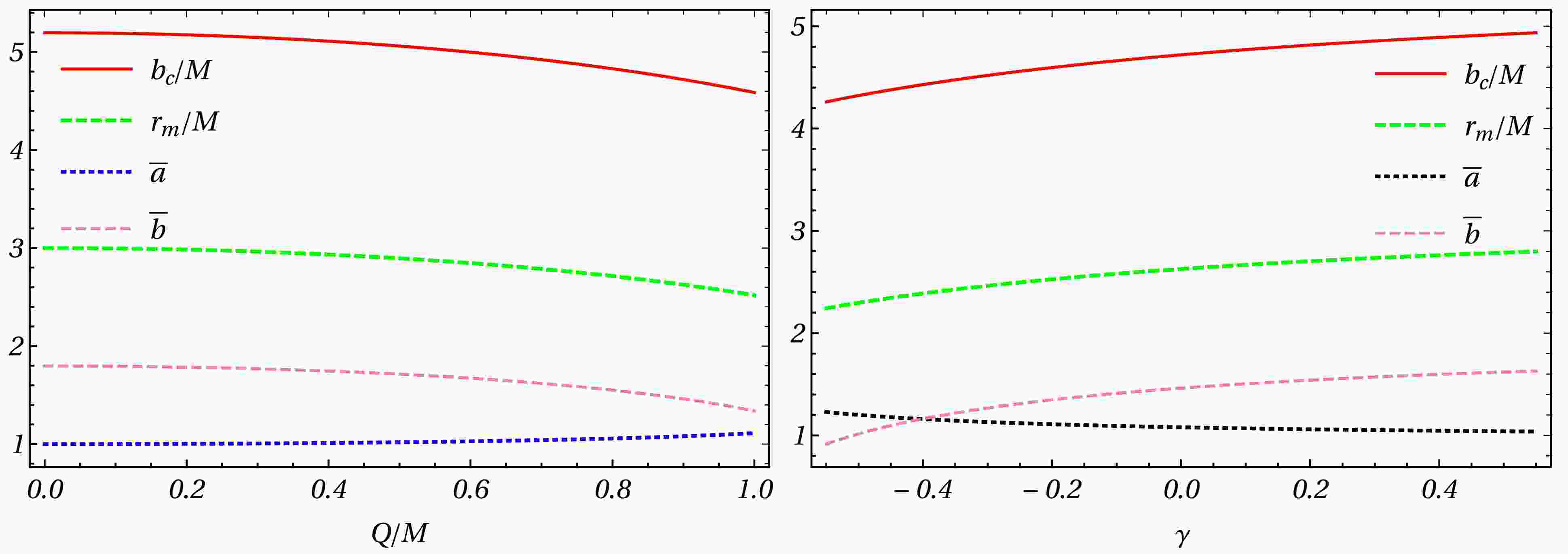 $ \overline{a} $ and$ \overline{b} $ are expressed as$ \overline{a} = \frac{r_m}{\sqrt{3M r_m -4 Q^2 \mathrm{e}^{-\gamma}}} $