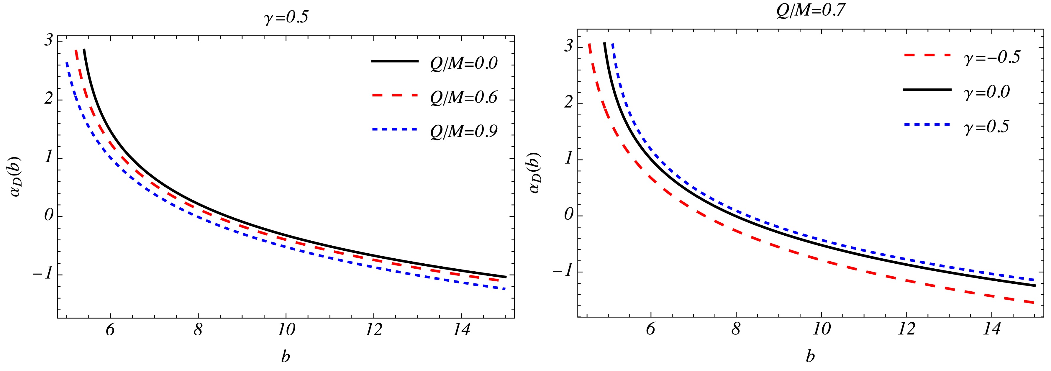 $ b_c/M , r_m/M, \overline{a}, $ and$ \overline{b} $ in the Dyonic ModMax spacetime as functions of Q/M and γ.$ \overline{a} = 1 $ and$ \overline{b} = -0.4002 $ at$ Q/M = 0, \gamma = 0 $ correspond to the values of a Schwarzschild black hole.Figure 2. (color online) Variation in deflection angle for Dyonic ModMax black hole spacetime as a function of the impact parameter b for different values of