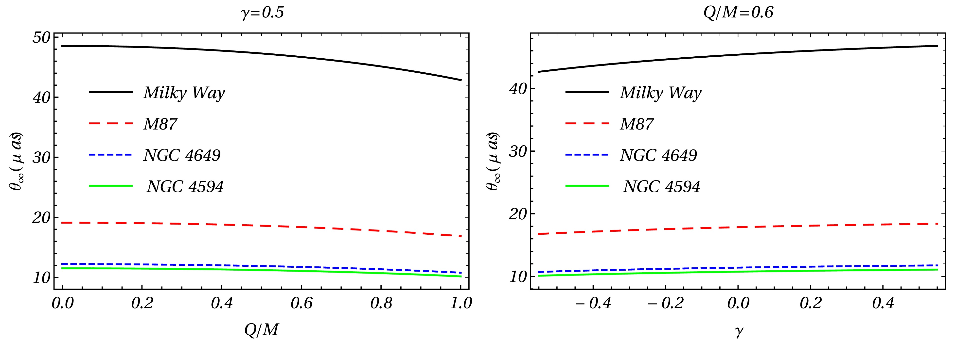 $ \theta_\infty $ as a function of parameters Q/M and γ in the strong field limit obtained by considering the spacetime around the compact object.Galaxy M( $ M_\odot $ )$ D_{OL} $ (Mpc)$ M/D_{OL} $ $ \Delta T^S_{2,1}(Schw) $ $ \Delta T^S_{2,1}(DM) $ Milky Way $ 3.61 \times10^6 $ 0.00762 $ 2.26467\times10^{-11} $ 11.4968 8.748 "NGC4486(M87)" $ 3.0 \times10^9 $ 16.1 $ 8.90733 \times10^{-12} $ 8021 7270 NGC4649 $ 2.0 \times10^9 $ 16.8 $ 5.6908 \times10^{-12} $ 8021 7270 NGC4697 $ 1.7 \times10^8 $ 11.7 $ 6.94569 \times10^{-13} $ 5347.34 4846.67 NGC5128(cenA) $ 2.4\times10^8 $ 4.2 $2.73158 \times10^{-12} $ 454.53 411.97 Table 3. Time delay between two relativistic images of different galaxies.