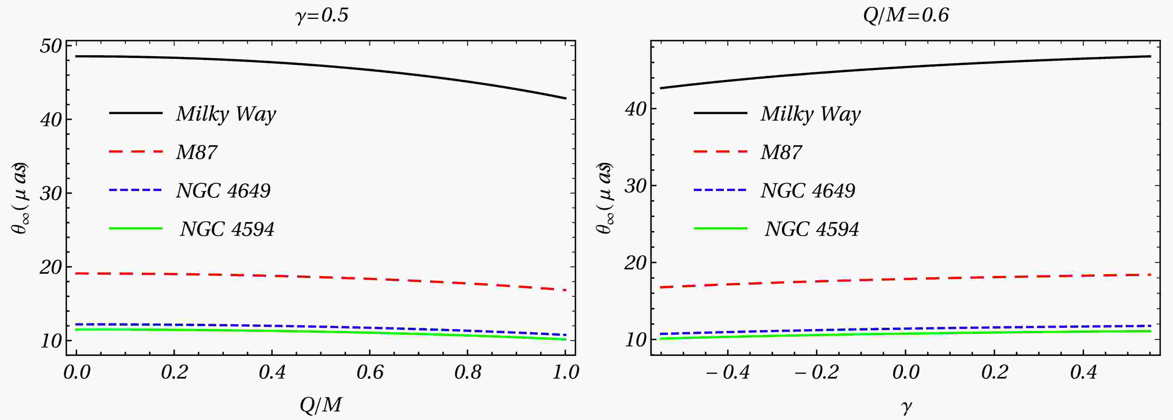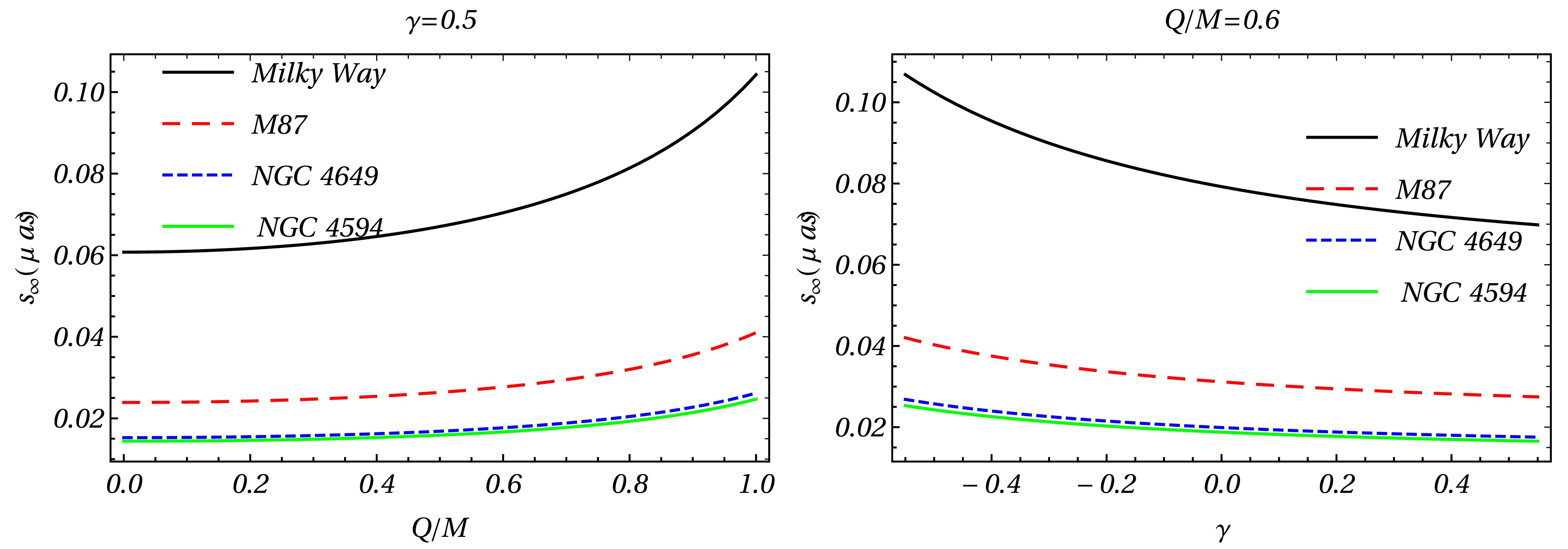 $ \theta_\infty $ ), angular separation between the outermost and asymptotic relativistic images ($ s_\infty $ ), and relative magnification of the outermost relativistic image with respect to other relativistic images ($ r_{\mathrm{mag}} $ ) for Milky Way, NGC4486, and NGC4649 for the case in which the charge of the black hole Q/M and γ parameters are fixed.The strong deflection limit coefficients