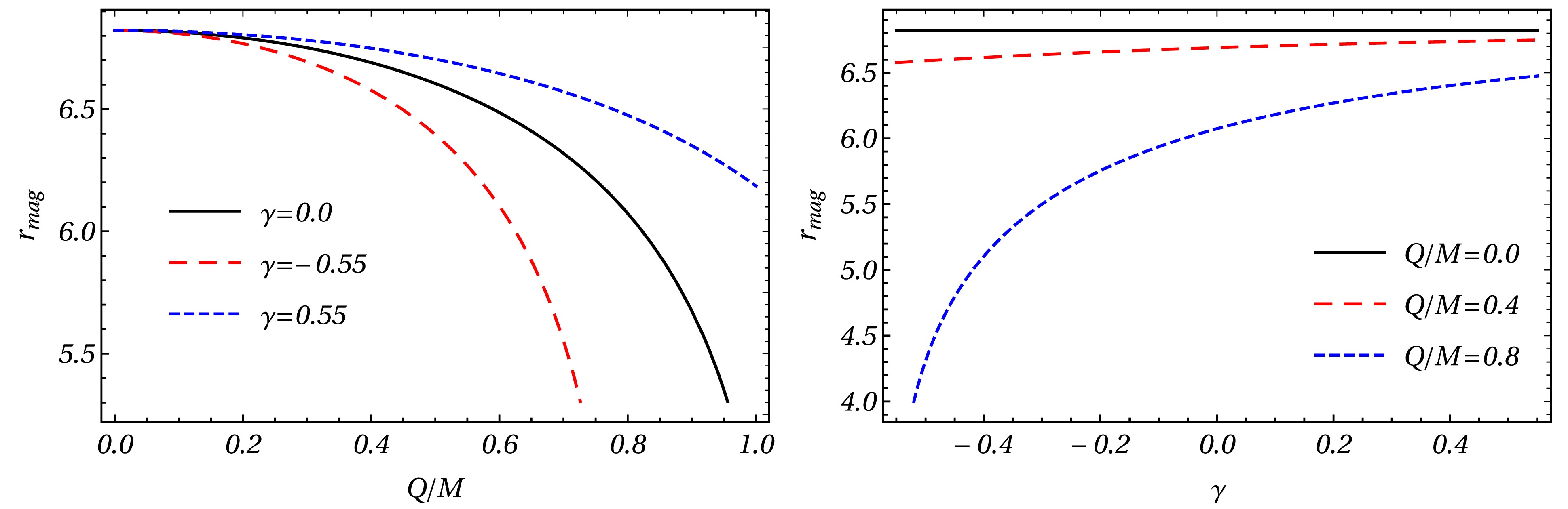(16) Eq. (15) thus clearly indicates that the Q and γ parameters negatively affect the horizon radius, and Eq. (16) provides the boundary values for charge Q in terms of M and γ.