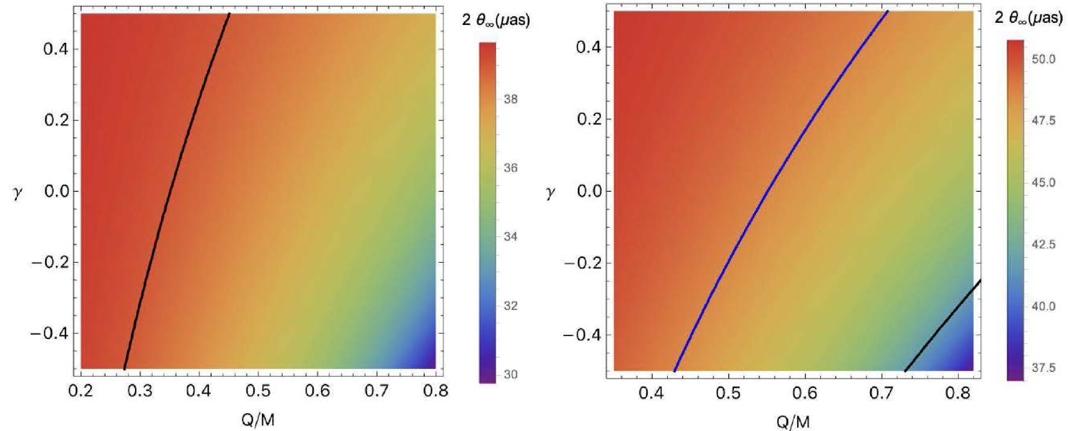 $ \theta_d=42\pm3\ \, \rm{\mu as} $ . The mass and distance of M87* from the solar system is$ M = 6.5\times 10^9 M_\odot $ and$ d = 16.8 $ Mpc, respectively [7, 66]. The constraints on M87* are depicted in the left panel of Fig. 6, which reveals a limited boundary region for the charge for negative values of γ , and a significantly larger region for positive values of γ. More specificly, the parameter constraints are$ 0.7\ge Q>0.4 $ and$ \gamma\ge-0.5 $ . The observational data of the supermassive BH Sgr A* may be analyzed using the same methodology. A study conducted by Akiyama et al. (2019) determined that the angular diameter of the shadow of the BH Sgr A* is approximately$ \theta_d = 48.7 \pm7\, \rm{\mu as} $ with an approximate mass of$ M\simeq4\times10^6M_\odot $ . The distance from Earth is approximately$ d\simeq 8 \, \text{kpc} $ . The results for Sgr A* are shown in the right panel of Fig. 6. The graph indicates that the allowed parameter region for Sgr A* is broader compared to that of M87*, namely$ Q \geqslant 0.3 $ and$ \gamma \geqslant -0.5 $ . This broader range can likely be attributed to the greater observational uncertainties associated with Sgr A*.Figure 6. (color online) Constraining parameter obtained using EHT observation for