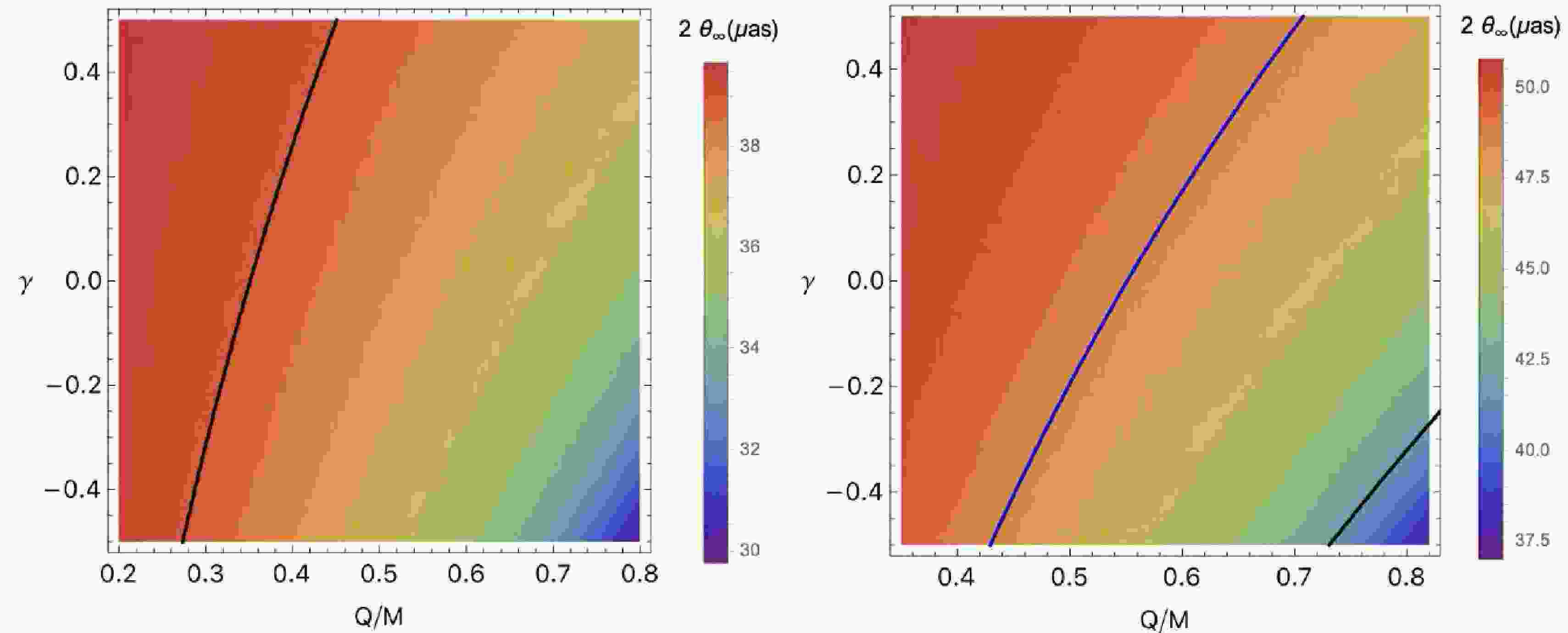 $ \overline{a} $ ,$ \overline{b} $ and the critical impact parameter values can be obtained using the measured values of s,$ r_{\mathrm{mag}} $ , and$ \theta_\infty $ . If$ \theta_\infty $ represents the asymptotic position of a set of images in the limit$ n \rightarrow\infty $ , then we consider that only the outermost image$ \theta_1 $ is resolved as a single image and all the remaining images are packed together at$ \theta_\infty $ . The measured values can be compared with those predicted by the theoretical models to check the nature of the black hole. Table 3 lists the observable values corresponding to various values of γ and Q. The results indicate that the Dyonic ModMax black hole exhibits unique and distinguishable observable characteristics compared to other configurations.One of the important conclusions in the study of deflection angle is that we can constrain the Dyonic ModMax spacetime parameter using EHT observation. Eq. (54) can be used to ascertain the specific values of these parameters that may be used to align the diameters of the M87* and Sgr A* BH, as determined by EHT. The angular size of the image of BH M87* is reported to be