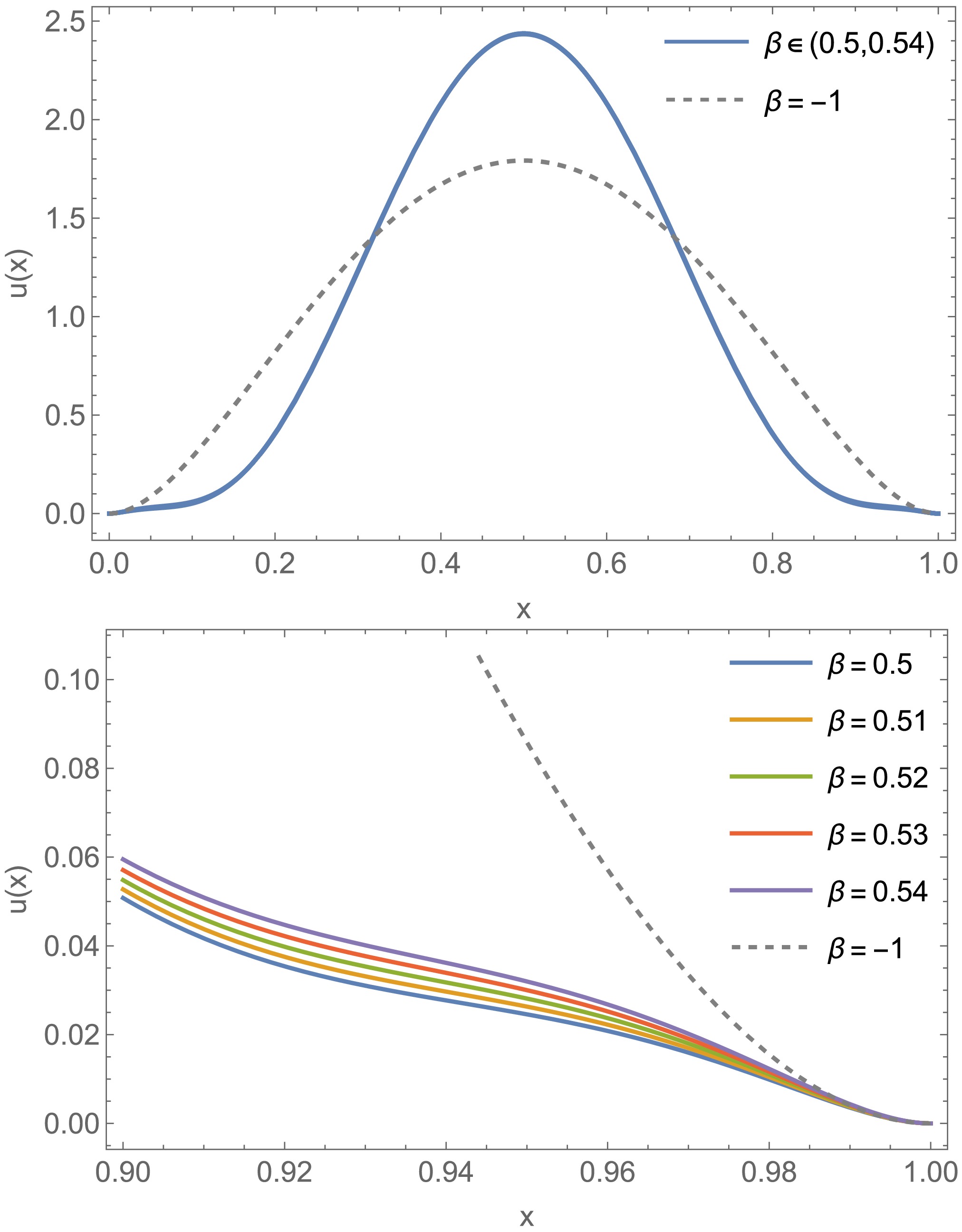 $ \beta = -1 $ and is divided by 10 for better comparison.Figure 1 illustrates the general properties of the first excited state DA [27, 28], which, in our model, is entirely attributed to the presence of a node in the BS amplitude. The symmetry is natural because we have assumed isospin symmetry. Like the ground state, the maximum occurs at