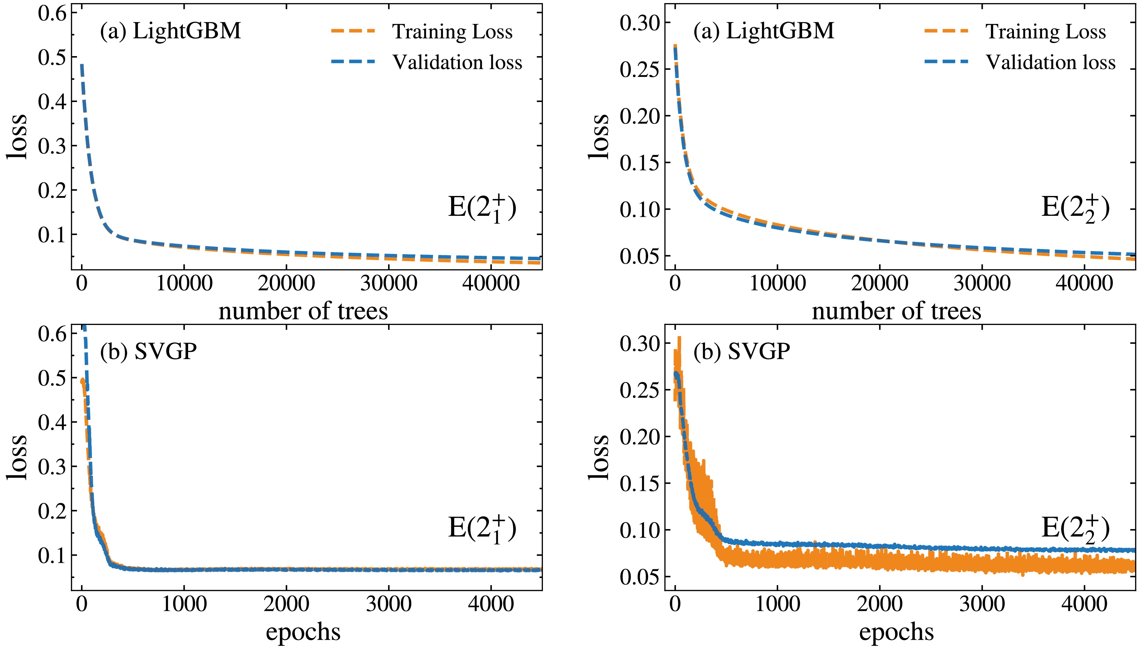 Figure 1.  (color online) Learning curves of the LightGBM and SVGP models for the prediction of the excitation energies of $ 2^+_1 $ and $ 2^+_2 $ states illustrate the evolution of the loss function with the number of training iterations (i.e., number of decision trees or training epochs).