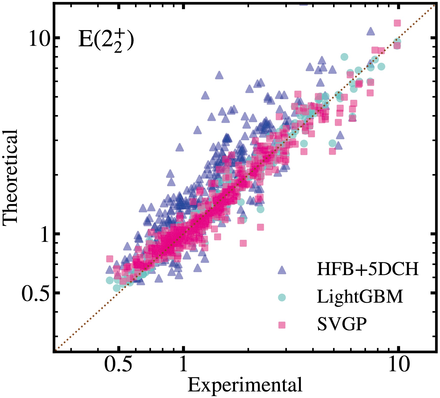 Figure 3 displays the excitation energies of the $ 2_2^+ $ states as derived from LightGBM, SVGP, and HFB+5DCH calculations, as a function of their corresponding experimental values. This comparison facilitates a comprehensive evaluation of the predictive power of each methodology across an extensive energy scale, spanning over an order of magnitude from approximately 0.3 MeV to 10 MeV. The analysis reveals that, on average, the HFB+ 5DCH model tends to overestimate the excitation energies $ E(2_2^+) $, predicting values that are approximately $ 25 $% higher than the experimentally observed ones [25]. By contrast, both SVGP and LightGBM exhibit reduced variance in their predictions, indicating greater consistency. Notably, the LightGBM predictions demonstrate a high degree of concordance with the experimental data, underscoring its superior accuracy compared to those of the HFB+5DCH and SVGP approaches.