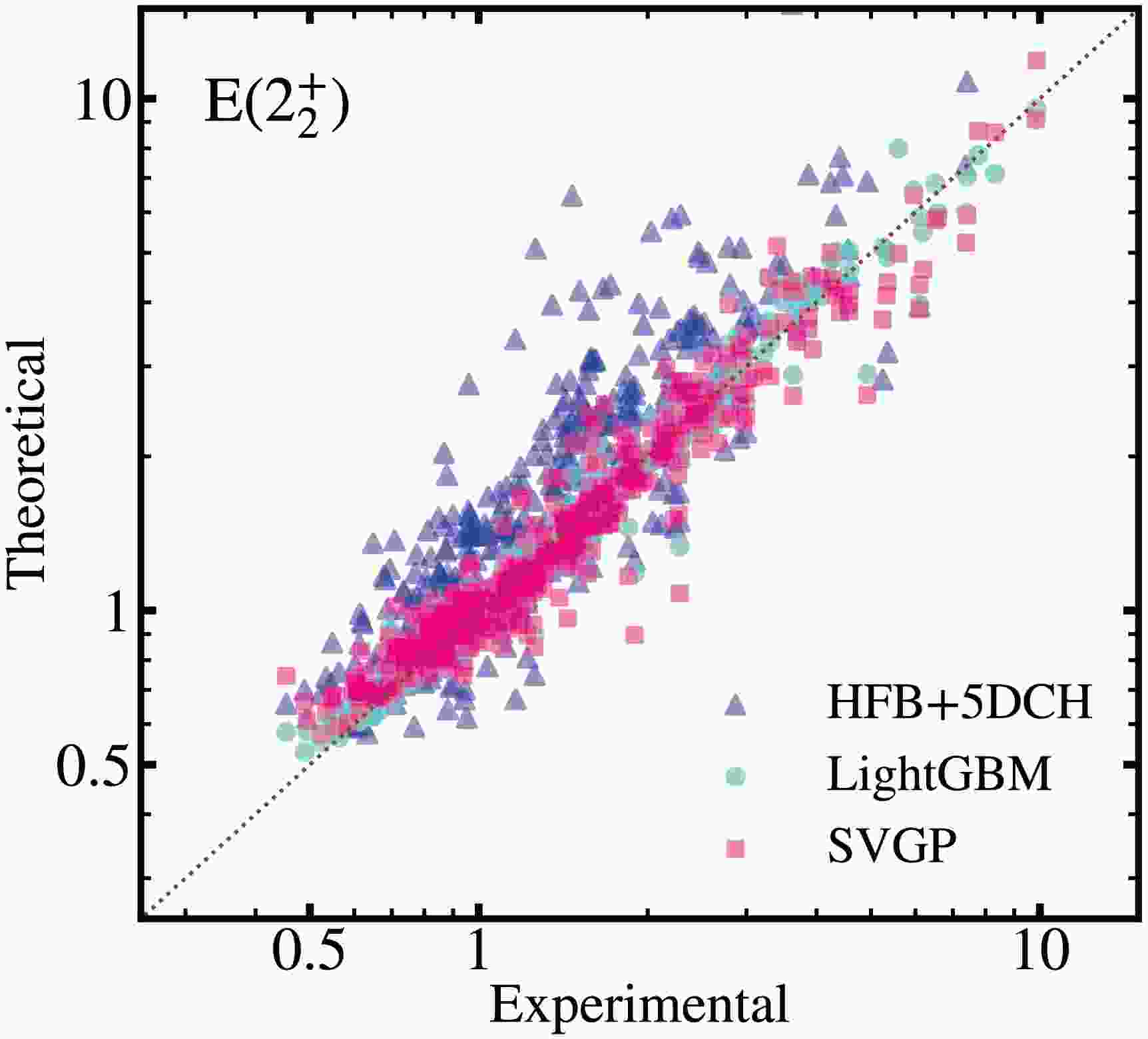 Performance of SVGP and LightGBM on the newly reported data. In addition to best reproduce the known $ E(2_1^+) $ and $ E(2_2^+) $ data across the nuclear landscape, one of important objective of this work is to apply the algorithms in the extrapolated region where experimental measurements are absent or currently inaccessible. In present work, we initially evaluate the extrapolation abilities of the LightGBM and SVGP algorithms by venturing beyond the training area using new data points. Fig. 8 compares a total of 12 newly reported data from 2020 to the present with the predictions from LightGBM and SVGP [7181]. These newly measured data points were not included in the training process. It is evident that LightGBM and SVGP demonstrate reasonable predictive capabilities outside the training region for these nuclei, showing good agreement within the uncertainty. This favorable outcome could be attributed to the newly measured nuclei, which differ by up to 2 nucleons from their nearest neighbors in the (Z, N) space of the training set, with a maximum difference of 4 for the $ 2_1^+ $ states. Additionally, although present results indicate that the employed machine learning models maintain strong generalization capability and stable predictive performance for the nuclei not so close drip lines and where neighbors exist, it is challenging to draw conclusions regarding the robustness of drip-line nuclei, where no close neighbors are present. This difficulty arises due to the weakly bound or unbound nature of these nuclei, which may lead to abnormal behavior. Such strong performance in these extrapolation tests instills confidence in the model's predictions for nearby nuclei that have not yet been experimentally investigated. However, as also indicated in Fig. 8, there are slightly discrepancies between the ML predictions and the experimental data for the $ ^{110} {\rm{Zr}}$. This differences may arise from the tentative assignment of spin and parity from the experimental side, or the enhanced triaxial deformation that the ML may not have adequately captured [75]. A attempt to include the triaxial deformation (γ) information from the sophisticated nuclear models in the feature space may enhance the prediction capability. It should be mentioned that all target values used for training were sourced from the National Nuclear Data Center [61] in this study. However, since experimental data on $ E(2_2^+) $ and $ E(2_1^+) $ are intrinsically limited (covering only a few hundred nuclei), we did not apply special filtering for cases with uncertain assignments during dataset construction. We will explore how to effectively incorporate experimental uncertainty or systematic bias into machine learning models, for example by introducing confidence-based weighting or using Bayesian frameworks, in order to enhance model robustness against label noise.