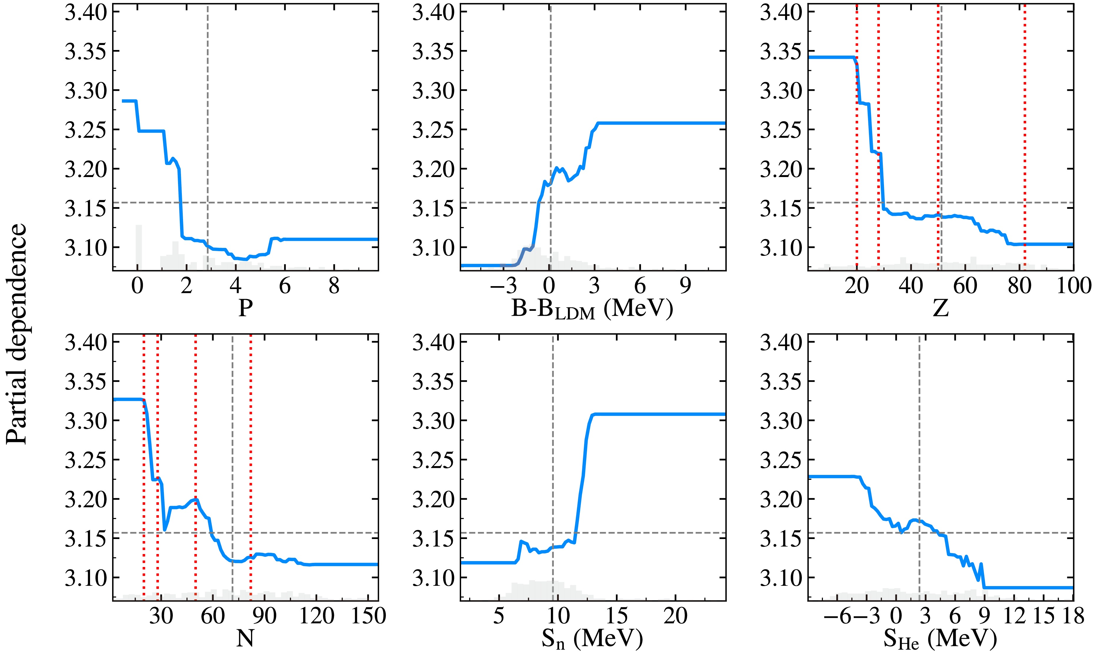 Figure 6.  (Color online) PDP analysis of the effect of input features on the excitation energies of $ 2_2^+ $ states. The blue lines represent the partial dependence value, while the gray columns represent the data point distribution for each input feature at a certain value. The red dashed lines indicate the positions of neutron or proton magic numbers.