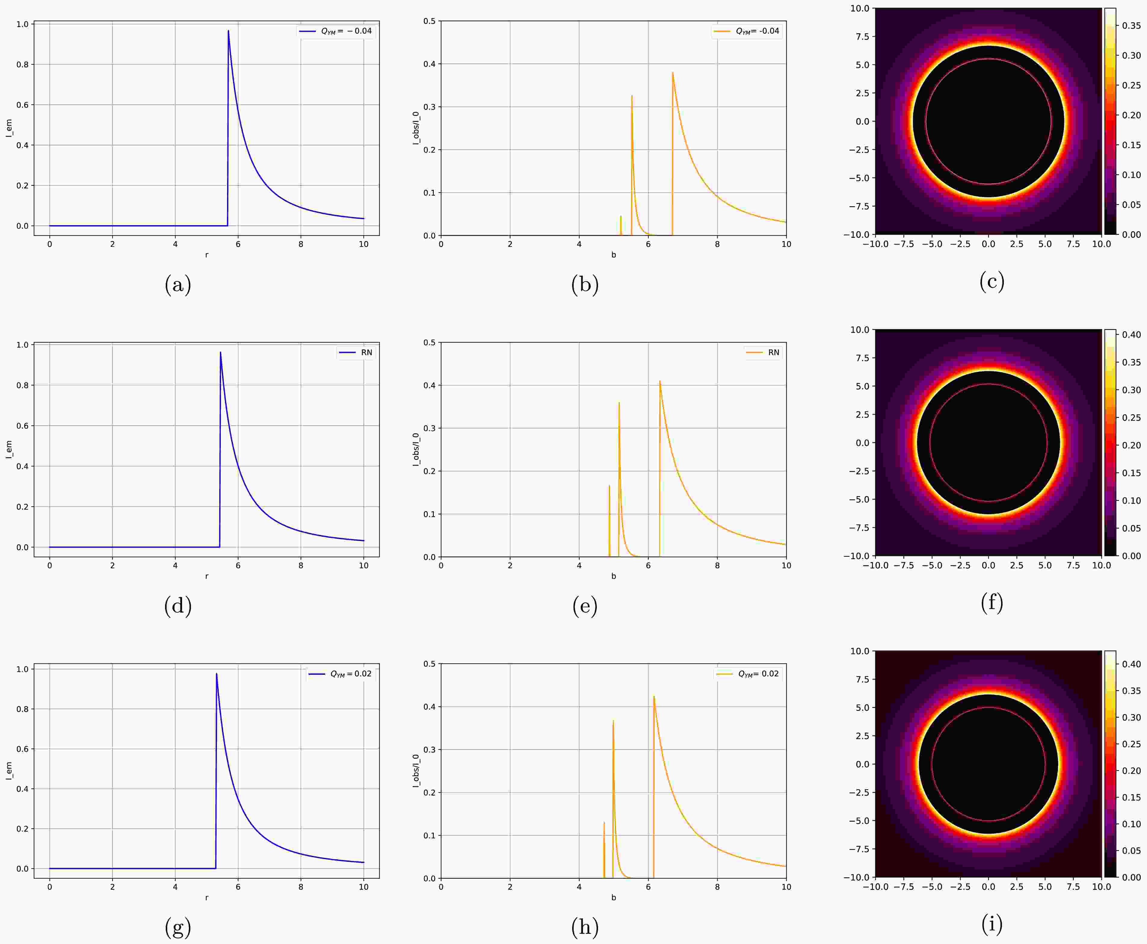$ Q_{\rm YM} $ takes values of$ -0.04 $ ,$ 0 $ , and$ 0.02 $ . The first column shows the emission intensity$ I_{\rm em2}(r) $ , the second column presents the total intensity$ I_{\rm obs}(b) $ observed by the observer, and the third column displays the optical appearance seen by the observer.