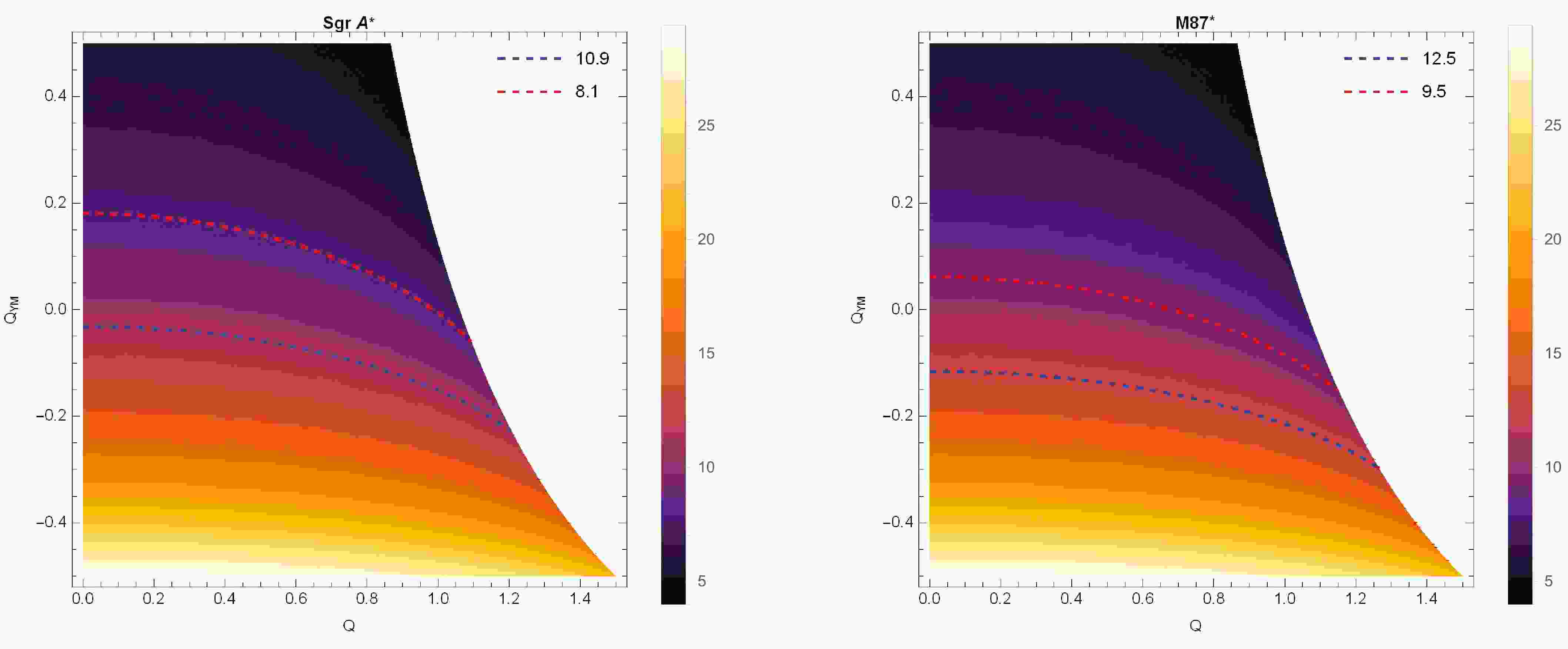 $ Q_{\rm YM} $ from observational data of Sgr A* (left-hand panel) and M87* (right-hand panel). The red and blue dashed lines represent the upper and lower bounds of the observed shadow diameters for Sgr A* and M87*, respectively.Subsequently, we specify the scenario considered in this work by fixing the electric charge at
