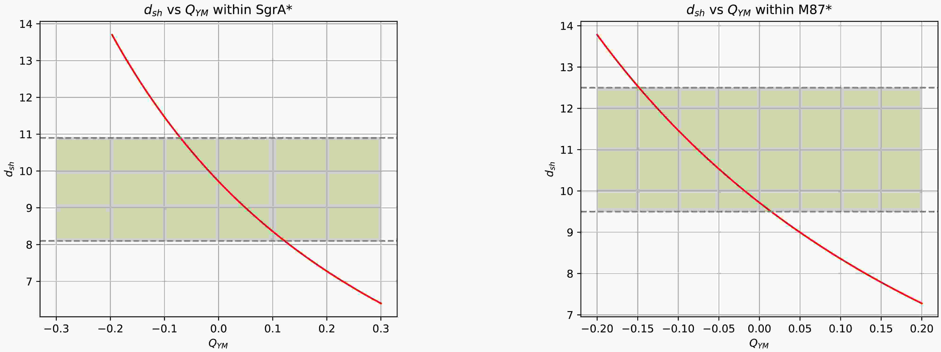 Figure 3. (color online) Constraints on the hair parameter from EHT observations of Sgr A* (left-hand panel) and M87* (right-hand panel). The red curve represents the variations in the shadow diameter with the hair parameter, and the green region indicates the possible range based on EHT observations.