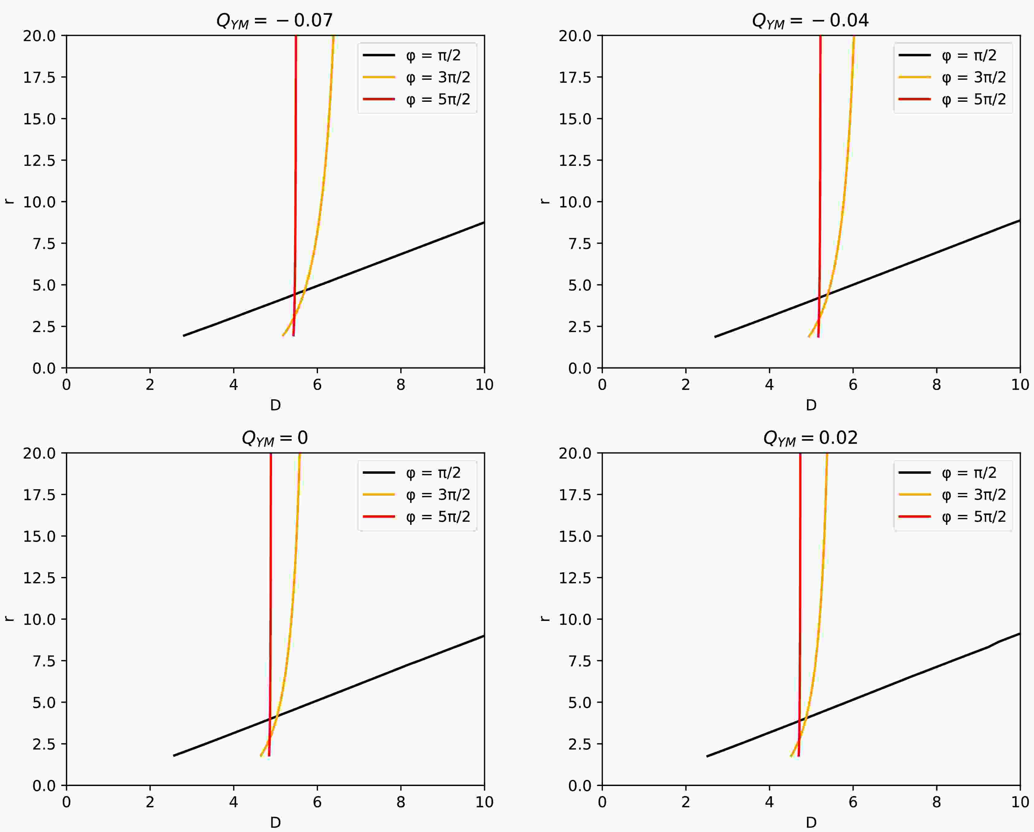 $ Q_{\rm YM}=-0.07 $ ,$ Q_{\rm YM}=-0.04 $ ,$ Q_{\rm YM}=0 $ ,$ Q_{\rm YM}=0.02 $ . Black, orange, and red curves represent the radial coordinates of intersections with the accretion disk once, twice, and thrice, respectively.From the figure, we can draw the following properties: