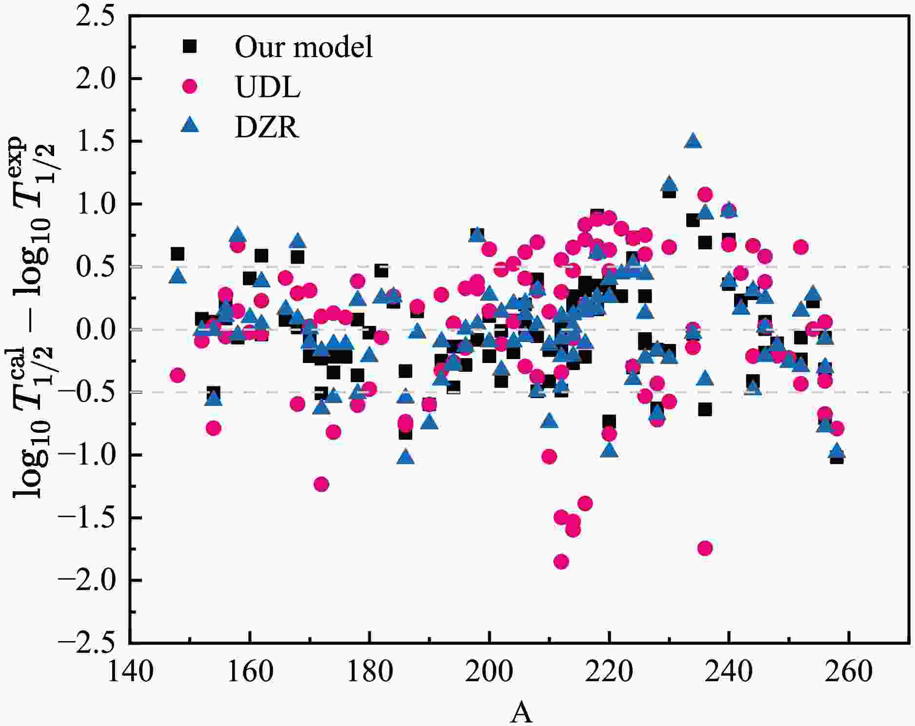 $ \log_{10} T_{1/2}^{{\rm{exp}}} $ and$ \log_{10} T_{1/2}^{{\rm{cal}}} $ are the logarithmic forms of experimental$ \alpha $ decay half-lives and the calculated ones, respectively. n is the number of nuclei involved in different decay cases. The standard deviation$ \sigma $ of the calculated results for the three models and/or formulas is shown in Table 4. From this table, we can clearly see that the standard deviation$ \sigma $ of our model only is 0.408 for all 559 nuclei, 0.323 for 177 even-even nuclei, 0.459 for 277 odd-A nuclei, and 0.391 for 105 odd-odd nuclei. These values are smaller than those of the UDL and DZR results, which proves that our model achieves satisfactory results.Formulas Total e-e e-o o-o Our model 0.408 0.323 0.459 0.391 UDL 0.589 0.349 0.633 0.632 DZR 0.436 0.337 0.493 0.423 Table 4. Standard deviations