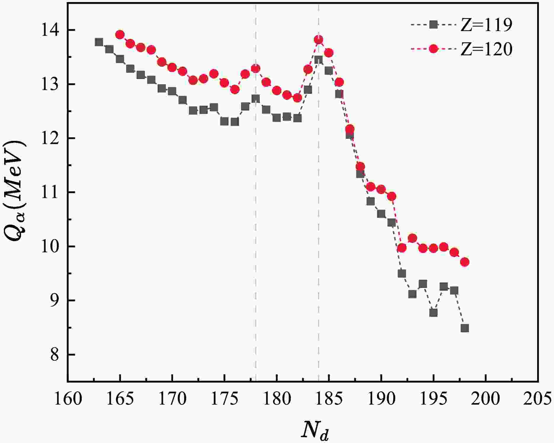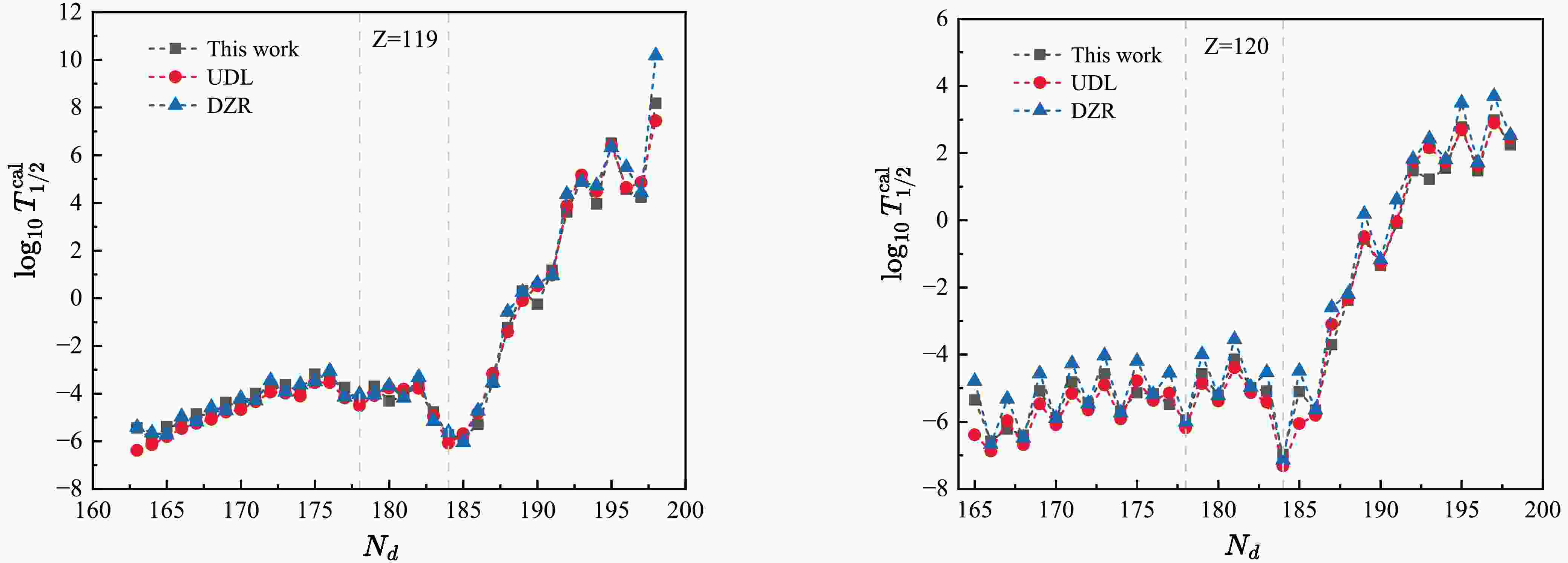$ \alpha $ decay show a very strong sensitivity to the$ \alpha $ decay energy$ Q_\alpha $ . Therefore, selecting a precise$ Q_\alpha $ becomes one of the key problems in prediction. In 2016, Sobiczewski et al. systematically compared nine different mass models: Möller et al. (FRDM) [84], Duflo and Zuker (DZ) [85], Nayak and Satpathy (INM) [86], Wang and Liu (WS3+) [87], Wang et al. (WS4+) [88, 89], Muntian et al. (HN) [90, 91], Kuzmina et al. (TCSM) [92], Goriely et al. (HFB31) [93], and Liran et al. (SE) [94] and came to the conclusion that the WS3+ model is the most accurate in reproducing the experimental$ Q_\alpha $ of superheavy nuclei. In this work, we use our model to predict the$ \alpha $ decay half-lives of 70 even-even, odd-A, and odd-odd nuclei with Z = 119 and 120. The predicted results are listed in Table 8. In this table, the first to fourth columns represent the parent nucleus,$ \alpha $ decay energy$ Q_\alpha $ calculated using WS3+, angular momentum l carried away by the$ \alpha $ particle, and$ \alpha $ preformation factors calculated by the CFM, respectively. The last three,$ \log_{10} T^{{\rm{cal}}}_{1/2} $ ,$ \log_{10} T^{{\rm{UDL}}}_{1/2} $ ,$ \log_{10} T^{{\rm{DZR}}}_{1/2} $ , represent the predicted$ \alpha $ decay half-lives in logarithmic form calculated by our model, UDL, and DZR, respectively. From this table, we can clearly see that the three predictions are quite close to each other. To visually illustrate their relationship, the logarithmic form of$ \alpha $ decay half-lives and the$ Q_\alpha $ values calculated by the WS3+ mass model with Z = 119 and 120 versus the neutron numbers of the daughter nucleus$ N_d $ , as well as the curve of the relationship between the$ \alpha $ decay preformation factors and neutron number of the parent nucleus N, are plotted in Figs. 5−7, respectively. From Fig 5, it can be seen that the trends of the$ \alpha $ decay half-lives for the isotopic chains with proton numbers Z = 119 and 120 predicted by our model, UDL, and DZR are consistent, and our predicted results are close to those of UDL. Furthermore, as shown in Fig. 5, for the isotope chains with Z = 119 and 120, when the neutron number of the daughter nucleus$ N_d $ is less than 176, the half-lives of$ \alpha $ decay exhibit a slow upward trend, followed by a gradual decrease to a minimum value at$ N_d $ = 178. From$ N_d $ = 178 to$ N_d $ = 182, it keeps a steady change. Then, it suddenly drops to the lowest point at$ N_d $ = 184, after which an upward trend appears again. A similar phenomenon can also be observed on$ Q_\alpha $ in Fig. 6. In addition, Fig. 7 clearly shows that the$ \alpha $ decay preformation factors of even-even nuclei with Z = 120, odd-A nuclei with Z = 119, and odd-odd nuclei with Z = 119 show a trend of first decreasing and then increasing near the neutron number N = 184 of the parent nuclei. However, this variation trend is not obvious in odd-A nuclei with Z = 120. When the neutron number is closer to the neutron magic number, the$ \alpha $ decay preformation factor is smaller, while it increases as the neutron number deviates further from this magic shell closure [95]. Moreover, during$ \alpha $ decay, when the neutron or proton numbers of the corresponding daughter nucleus are magic numbers, the half-life reaches its minimum value [96, 97]. When the neutron number exceeds the neutron magic number by two nucleons, the parent nucleus tends to become stable by emitting an$ \alpha $ particle. In this case, the half-life will reach its minimum value. The depth of the minimum value depends on the stability of the daughter nucleus, meaning that the more stable nucleus corresponds to a deeper minimum value. From the above content, we can conclude that N = 184 is the possible neutron magic number, while N = 178 can be considered the neutron submagic number [97].Nuclide $ Q_{\alpha} $