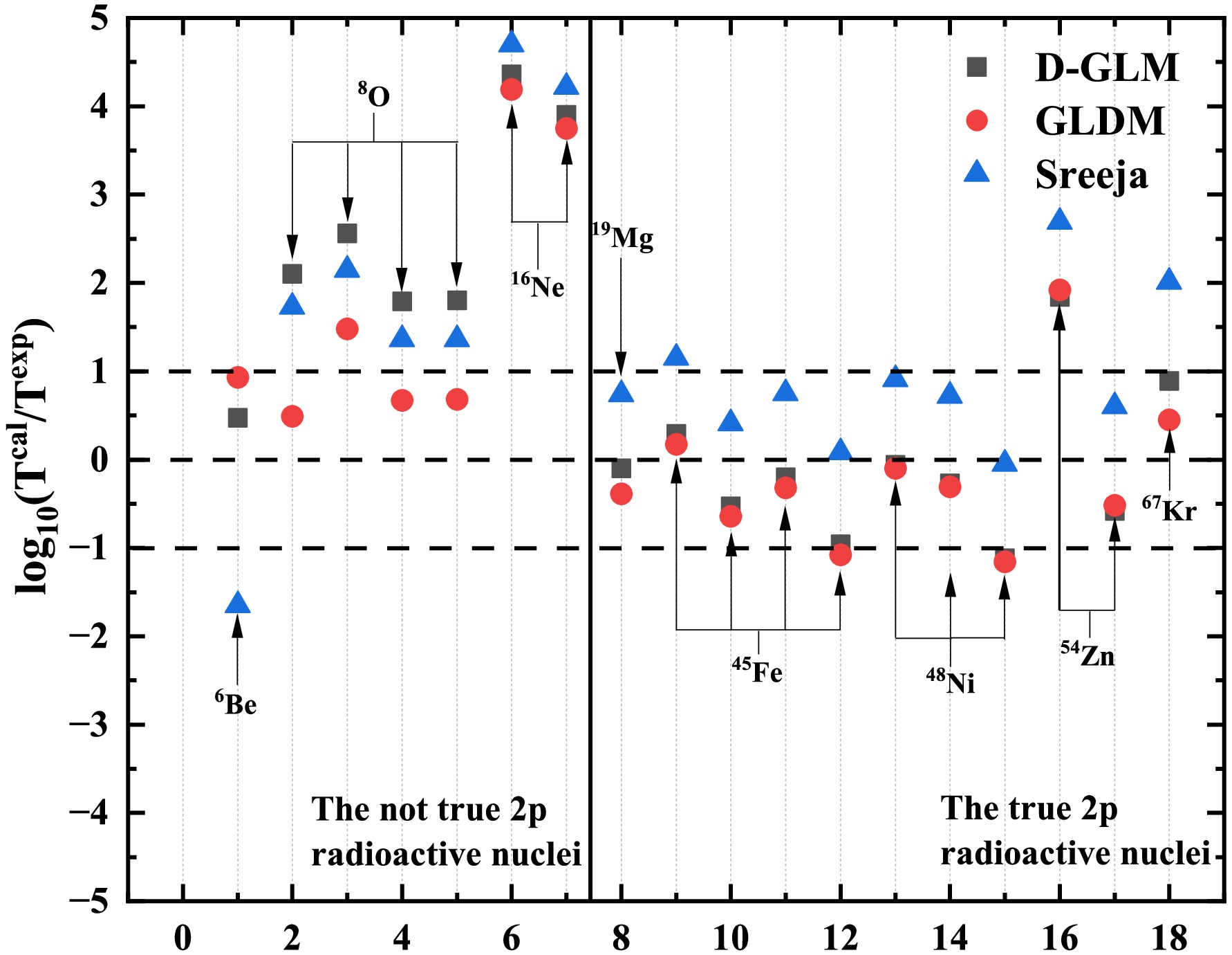 For a more intuitive comparison, logarithmic differences between the calculated and experimental radioactivity half-lives are presented in Fig. 2. As shown in the figure, the deviations between the calculated and experimental half-lives for true 2p radioactive nuclei fall within one order of magnitude. This indicates that the DGLM successfully reproduces the experimental 2p radioactive half-lives. The standard deviation (