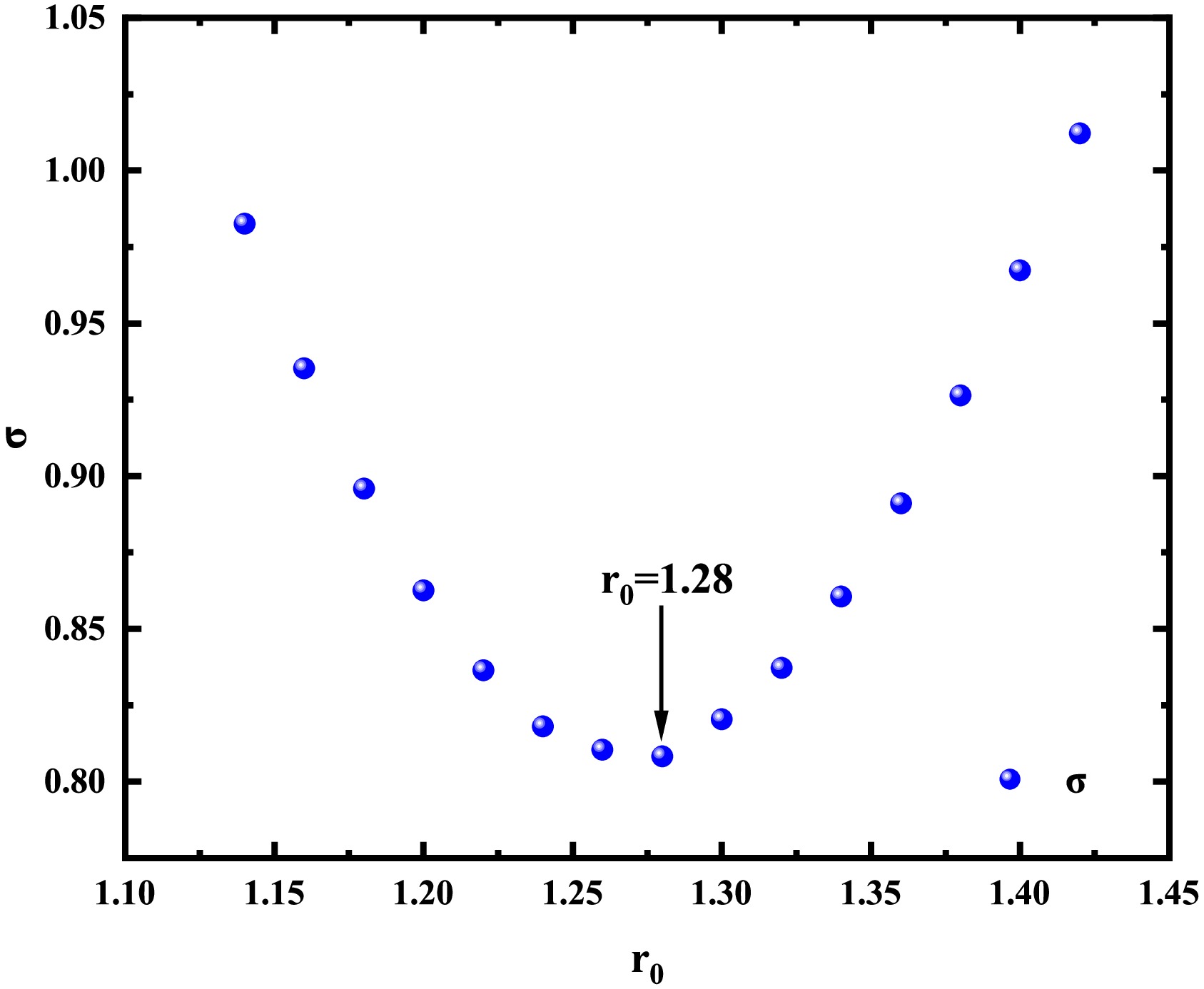 Figure 3. (Color online) Dependence of the standard deviation between theoretical and experimental half-lives on the effective nuclear radius. Minimal standard deviation is achieved at