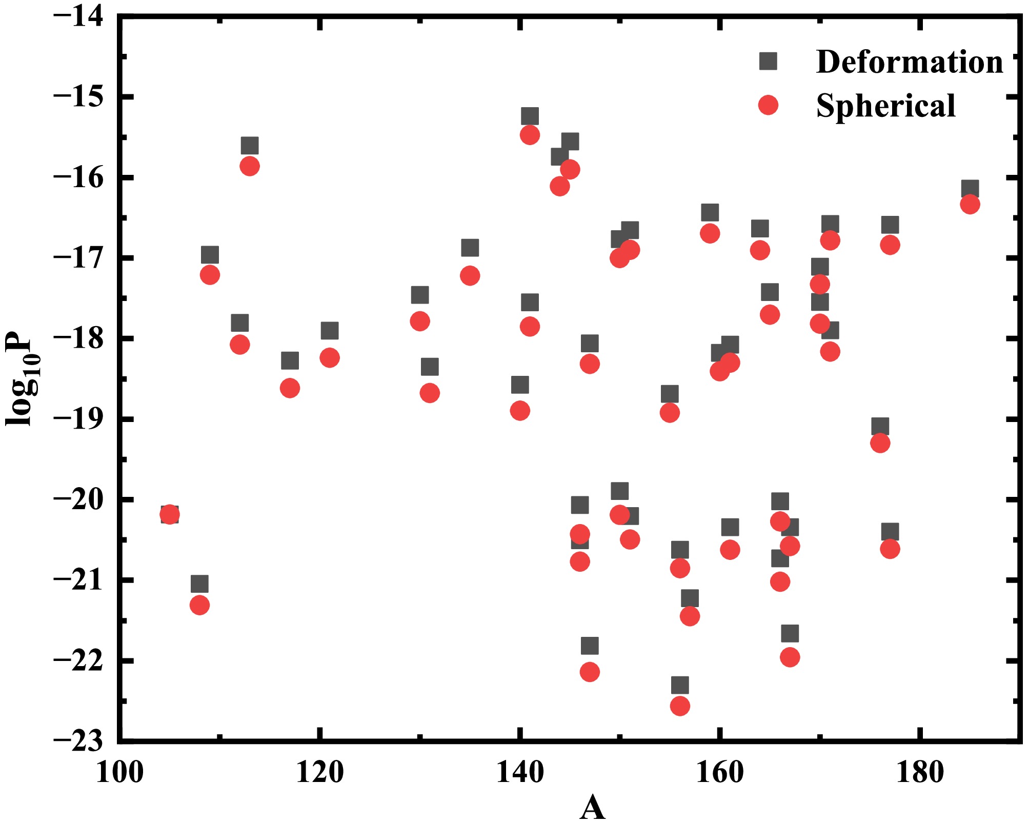 $ r_0 = 1.20 $ fm, we calculated the corresponding penetration probabilities. These results are shown in Figure 4, where the horizontal axis displays the mass number (A) of the proton-emitting nuclei and the vertical axis represents the logarithmic scale of the proton radioactivity penetration probability. Black squares and red circles denote the penetration probabilities using the DGLM and GLM, respectively.