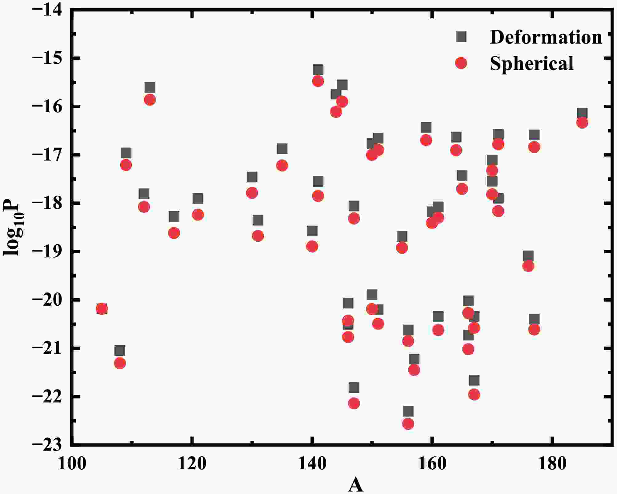 $ S_{\rm{p/2p}} $ represents the spectral factor for either single-proton or two-proton radioactive systems;$ P $ denotes the proton's barrier penetration probability, while$ \nu $ is its collision frequency with the potential barrier.When deformation effects are considered, both the radius