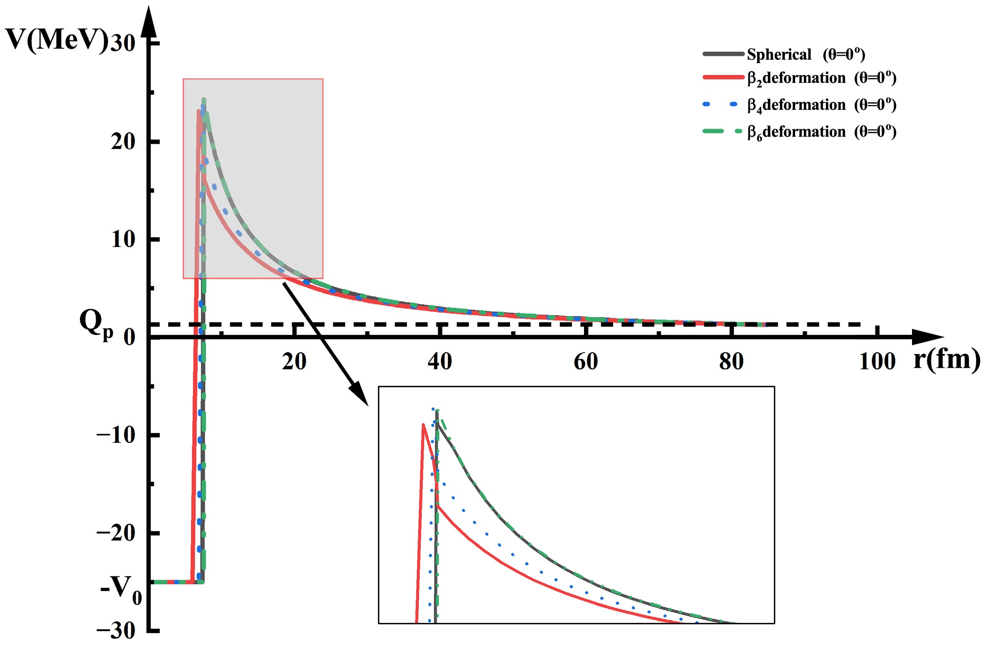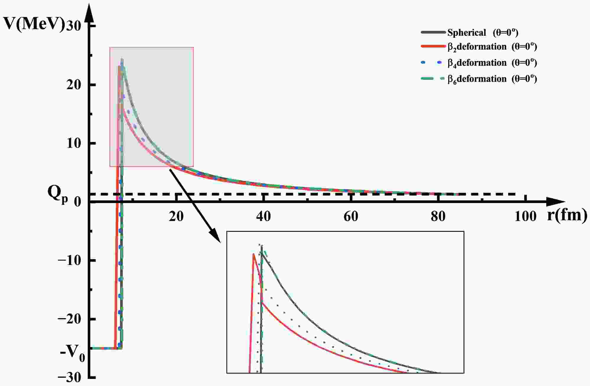 $ V_{0} $ represents the depth of the inner square well,$ V_{0}=25A_{\rm{p/2p}}$ MeV [74].$ V_{\rm{c}} $ denotes the Coulomb interaction between the daughter nucleus and the emitted proton. Taking into account the impact of the deformation of the daughter nucleus on the Coulomb potential, the expression for the Coulomb potential is derived as follows:$ \begin{aligned}[b] V_{\rm{c}}(r,\theta ) =\;&\frac{Z_{\rm{d}}Z_{\rm{p/2p}}{\rm{e}}^{2}}{r}+ \frac{3Z_{\rm{d}}Z_{\rm{p/2p}}{\rm{e}}^{2}}{r}\sum\limits_{\lambda =2,4,6}\frac{ 1}{2\lambda +1} \\ & \times \lbrack \frac{R_{\rm{d}}(\theta )}{r}]^{\lambda }Y_{\lambda 0}(\theta )\beta _{\lambda }, \end{aligned} $