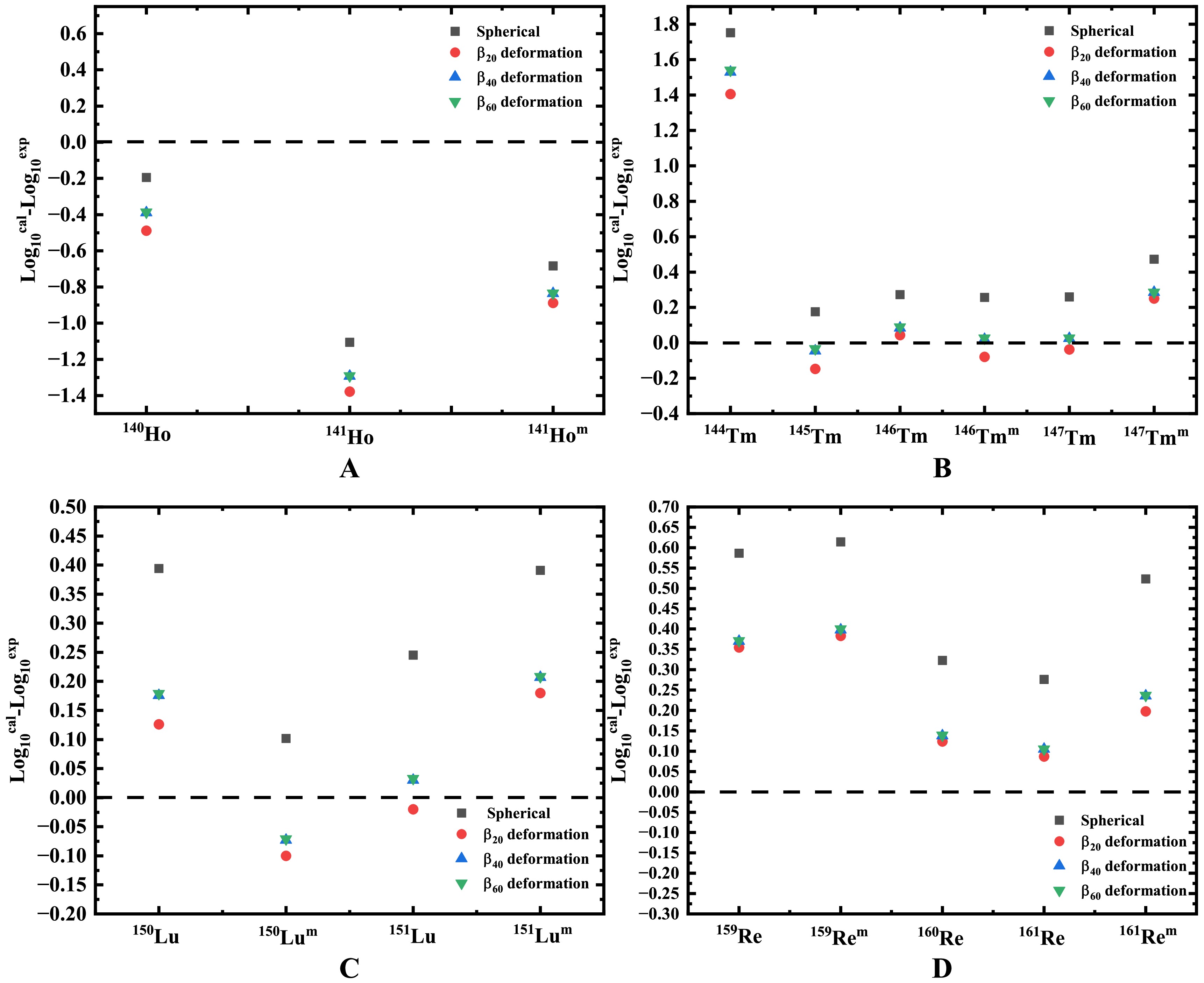 To further assess how nuclear deformation affects proton radioactivity half-lives, we computed individual half-lives considering quadrupole, hexadecapole, and hexacontatetrapole deformations. These results were then compared to those from the GLM, as shown in Figure 6. Our analysis indicates that the calculated half-life decreases with the inclusion of deformation effects, with the most significant reduction observed when only quadrupole deformation is considered. For rhenium (Re), the calculated half-life under quadrupole deformation shows the most significant deviation among all. A similar trend is observed for holmium (Ho), lutetium (Lu), and thallium (Tl). These findings confirm that quadrupole deformation plays a pivotal role in reducing proton radioactivity half-lives. This insight deepening our understanding of the nuclear structure of these exotic nuclei.