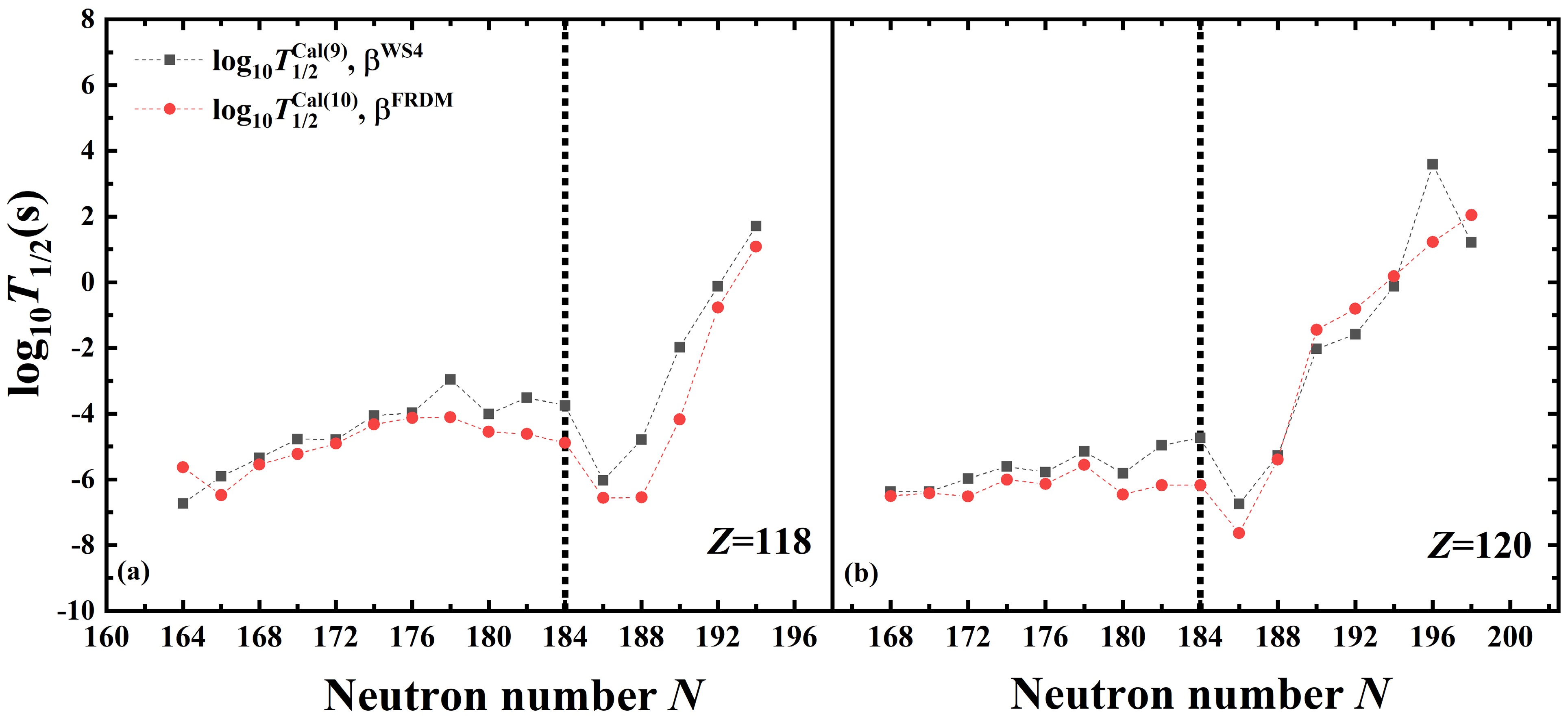 $ a_0 $ . The$ Q_{\alpha} $ and nuclear deformations$ \beta_2 $ ,$ \beta_4 $ , and$ \beta_6 $ are taken from the WS4 [49] and FRDM [55] models, respectively. The corresponding results of logarithms of α-decay half-lives are denoted by$ \log_{10}T_{1/2}^{\rm{Cal(9)}} $ and$ \log_{10}T_{1/2}^{\rm{Cal(10)}} $ , respectively. The black dashed lines denote the neutron number N = 184. -