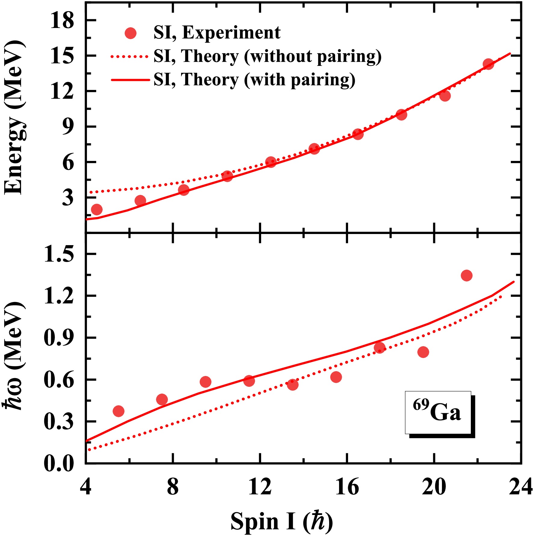 Figure 1. (color online) Calculated excitation energies (upper panel) and rotational frequency (lower panel) as functions of the angular momenta for the positive-parity band SI in 69Ga with and without pairing, in comparison with the data [27].