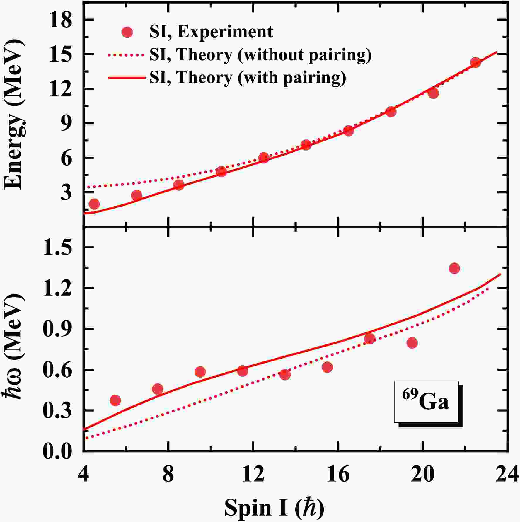 $ Z=28 $ closed shell, the odd-mass Ga isotopes present a diverse spectral structures and has caught much attention [17−20]. Many experimental efforts have been devoted to measure the spectra of 69Ga since 1956 [21]. These investigations reported various low-lying negative-parity states generated by single-particle excitations involving$ 1f_{5/2} $ ,$ 2p_{3/2} $ ,$ 2p_{1/2} $ and$ 1f_{7/2} $ orbitals [22−26]. Very recently, through the$ ^{26}\text{Mg}(^{48}\text{Ca},p4n\gamma) $ multi-nucleon transfer reaction, the negative-parity level scheme of 69Ga has been considerably extended. In addition, three positive-parity bands, namely bands SI, SII, and SIII, were observed[27], and better understanding for their nature necessitates the further theoretical studies.Theoretically, the spectroscopic properties of nuclei in the