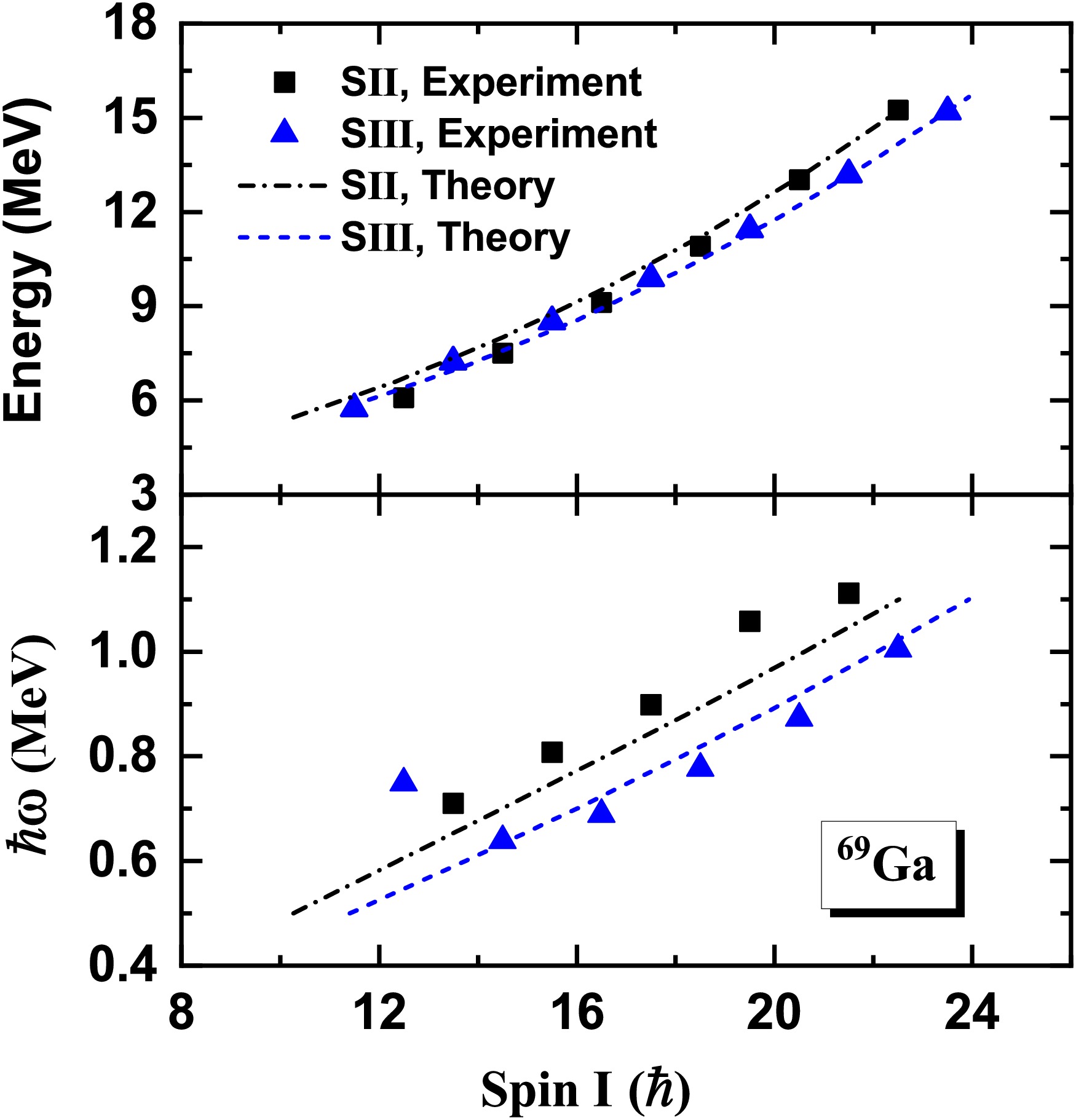 The calculated energy spectra and angular momenta for the positive-parity bands SII and SIII in 69Ga as well as their comparison with the data [27] are shown in Fig. 2. The spins for the band heads of SII and SIII are already larger than