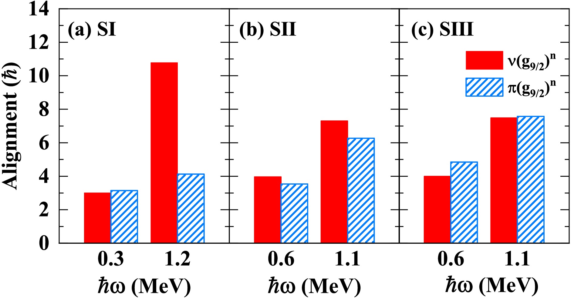 $ g_{9/2} $ proton and neutron particles for the bands SI (a), SII (b) and SIII (c), calculated by the TAC-CDFT without the pairing correlations.Finally, the B(E2) values for the positive-parity bands SI, SII and SIII are predicted and are shown as functions of the angular momenta in Fig. 4. The