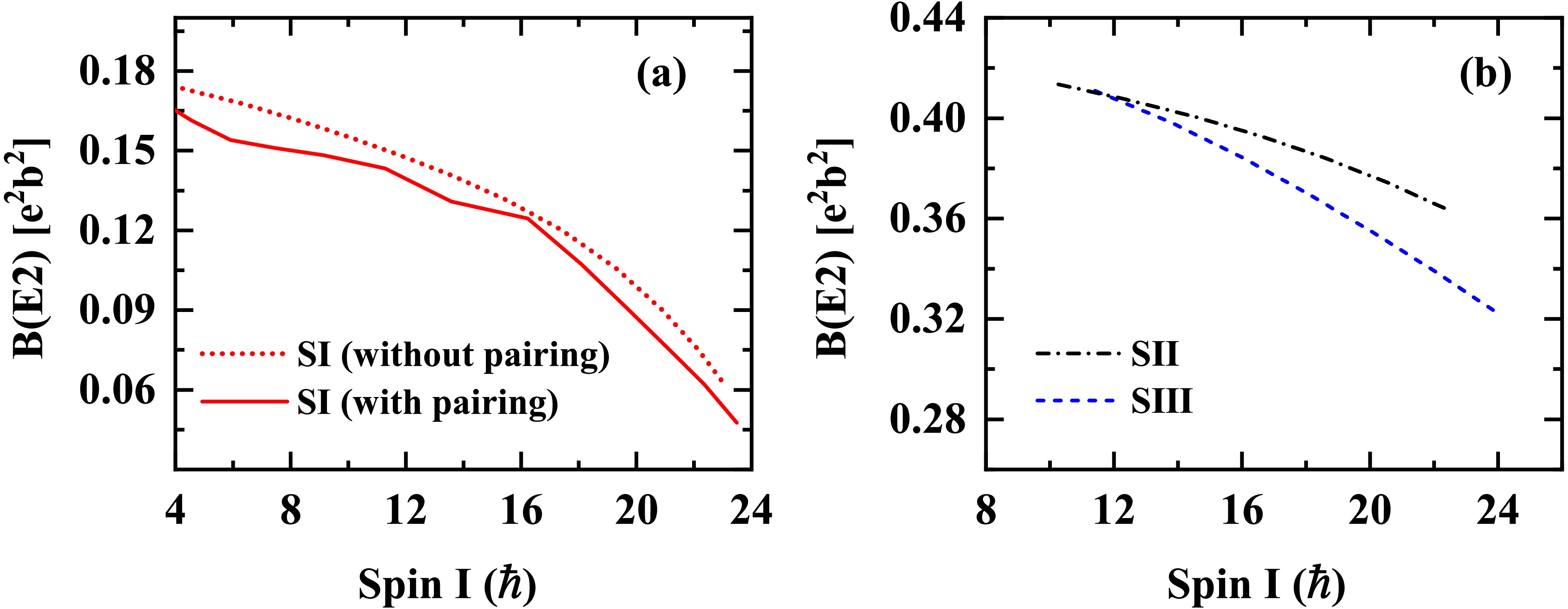 $ B(E2) $ values exhibit a decreasing tendency for all these bands. This is caused by the fact that their deformation parameters β decrease with the total angular momenta. For band SI, when taking into account the pairing correlations, the$ B(E2) $ values are slightly reduced. For the signature partner bands SII and SIII, the calculated$ B(E2) $ values are close at spin$ I \approx 23/2\hbar $ . At higher spins, however, the$ B(E2) $ values of band SII become larger than those of band SIII. Future experimental efforts including the measurement of lifetimes of these states are required to validate our predictions. -
