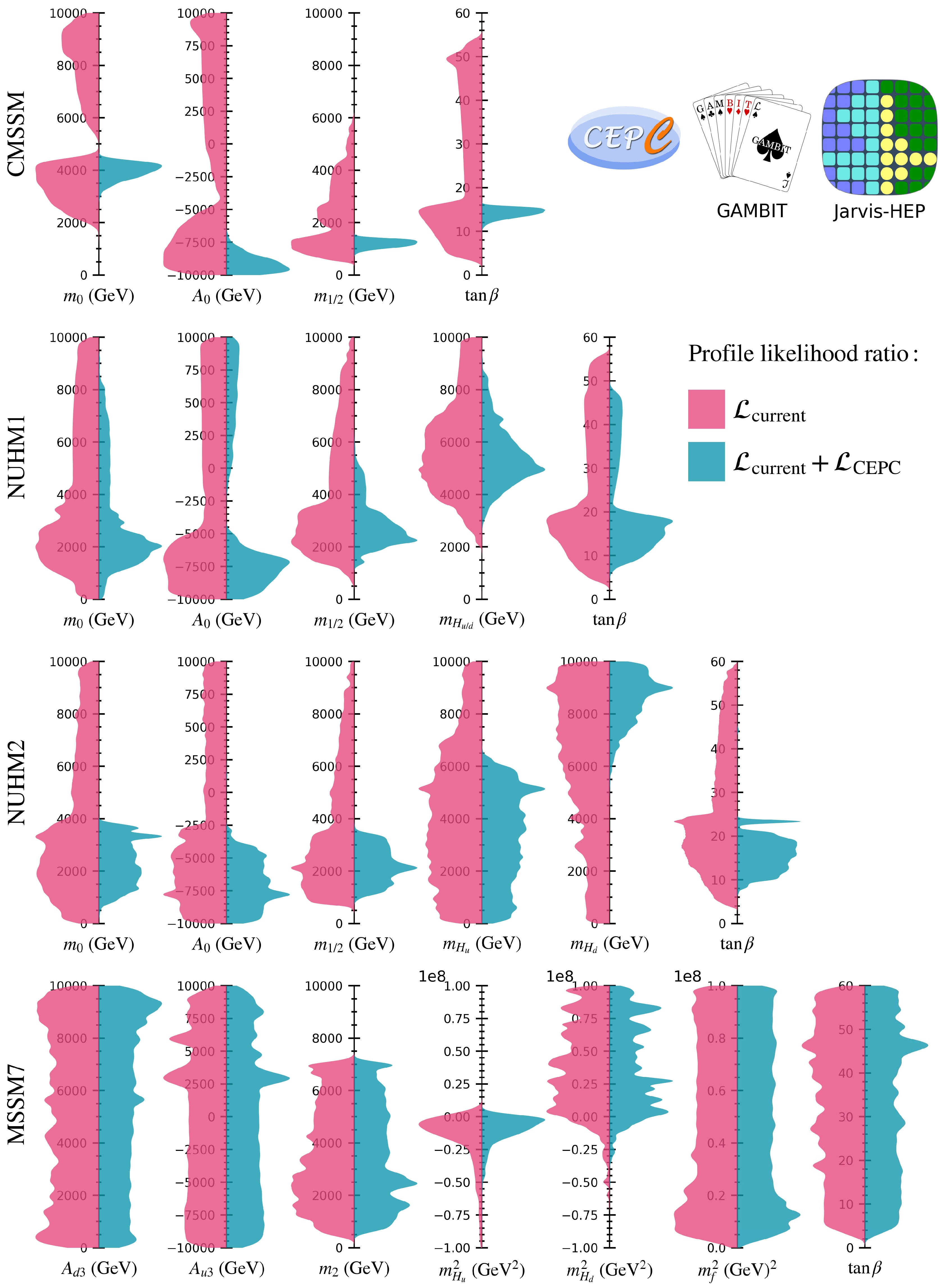 Figure 100. (color online) One-dimensional profiled likelihood ratio for the global fit of the CMSSM, NUHM1, NUHM2, and MSSM7 models, using the present experimental data (left parts) and considering additional CEPC measurements (right parts).