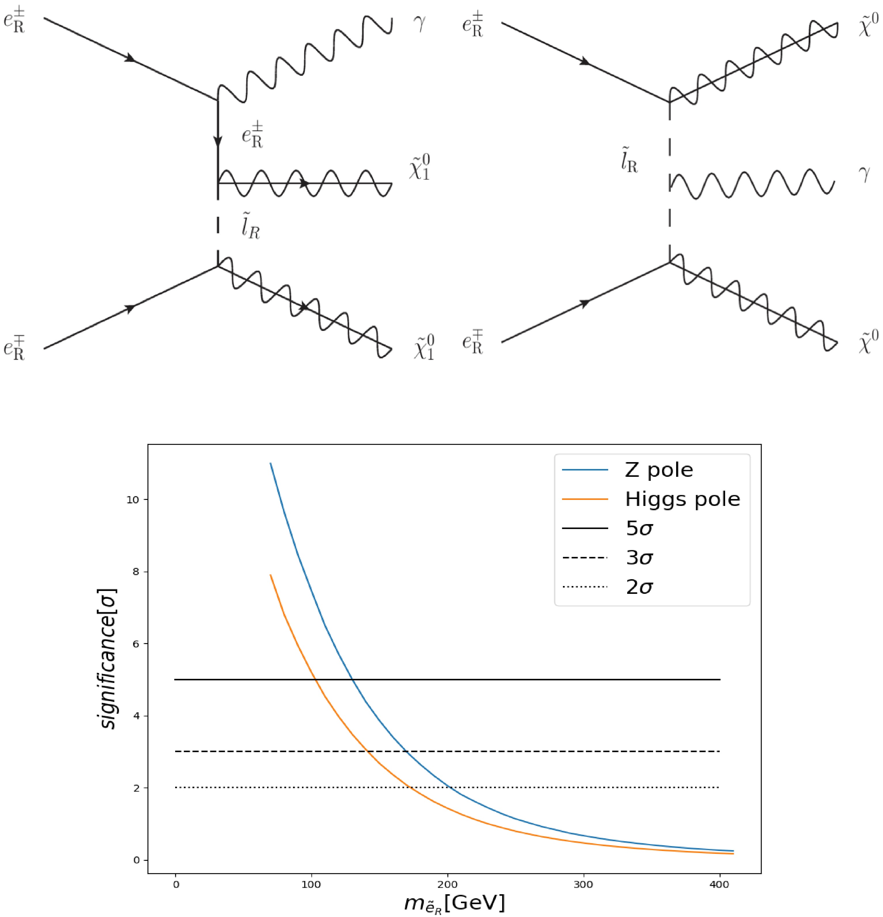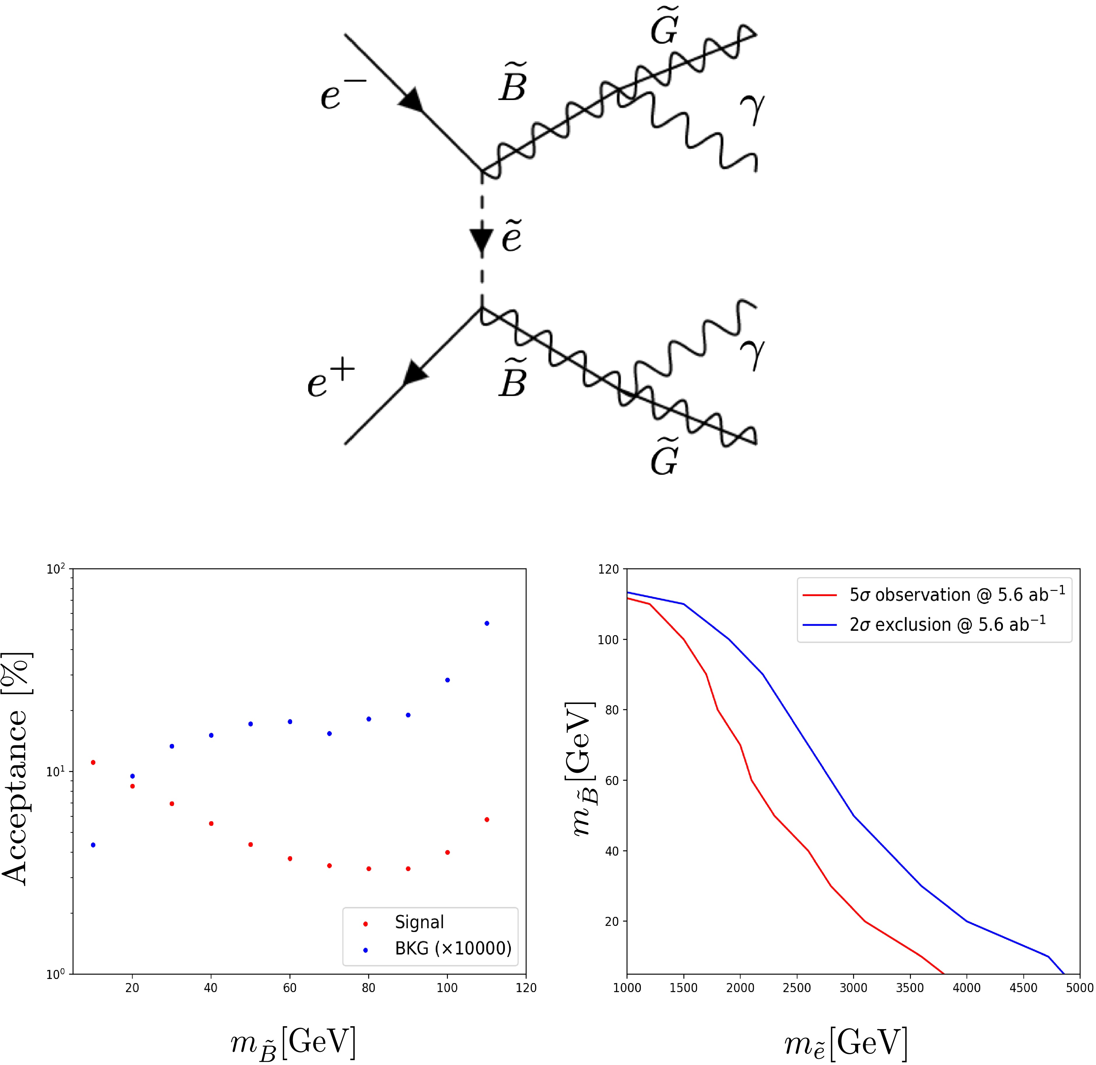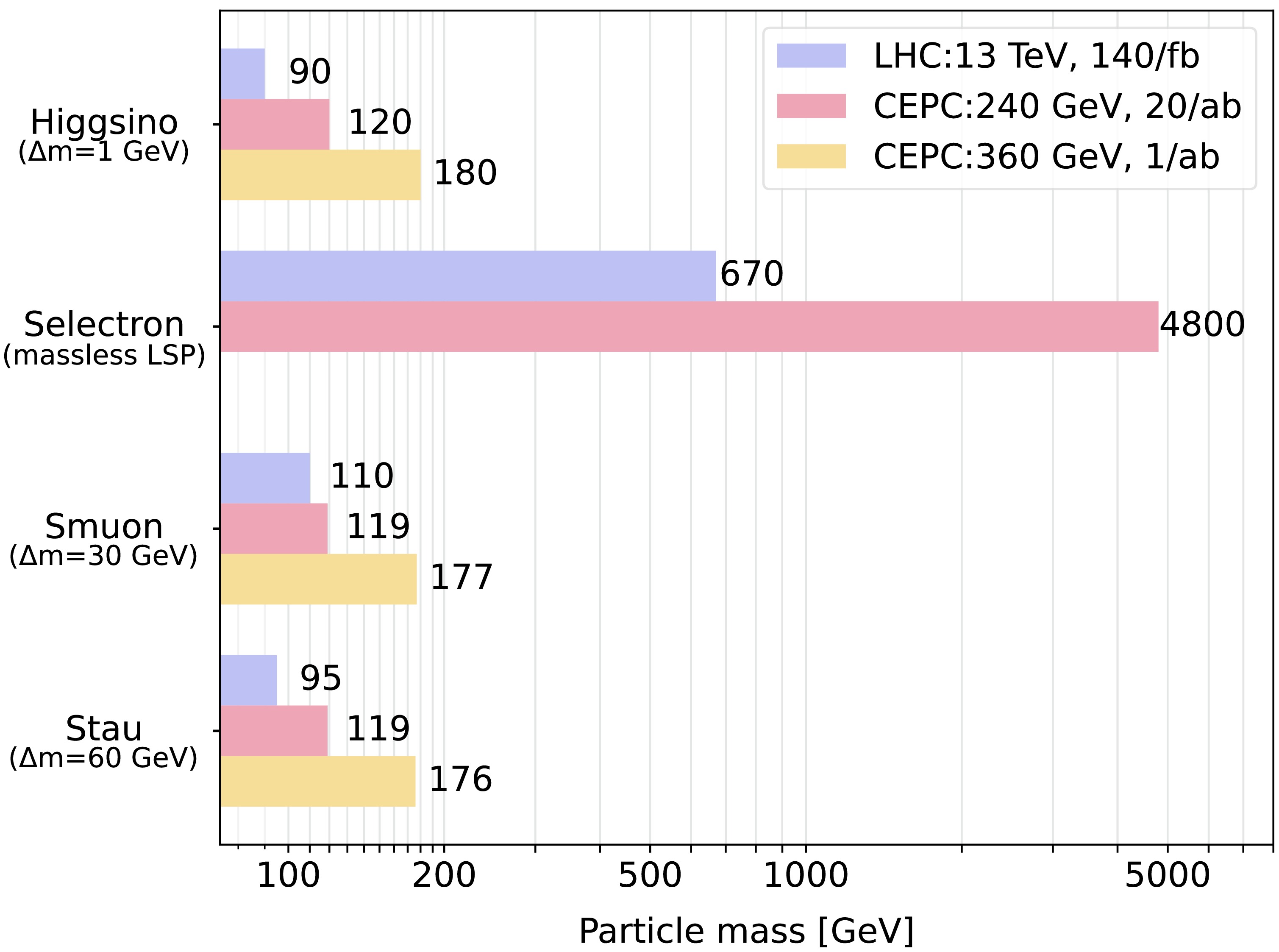 The new physics discovery power could also be expressed in the explorable energy range. Using the SMEFT framework and considering the high precision measurements on EW and Higgs sectors, the CEPC could explore the New Physics with an energy scale of 10–100 TeV, which is roughly one order of magnitude higher than that of the HL-LHC. CEPC is sensitive to the SUSY Particles with mass scale range from the beam energy up to 5 TeV (for the SUSY partner of the electron could be detected via t-channel exchanges). CEPC is sensitive to the New Physics at an energy scale much higher than the center-of-mass energy, for example, it could explore new physics with an energy scale of