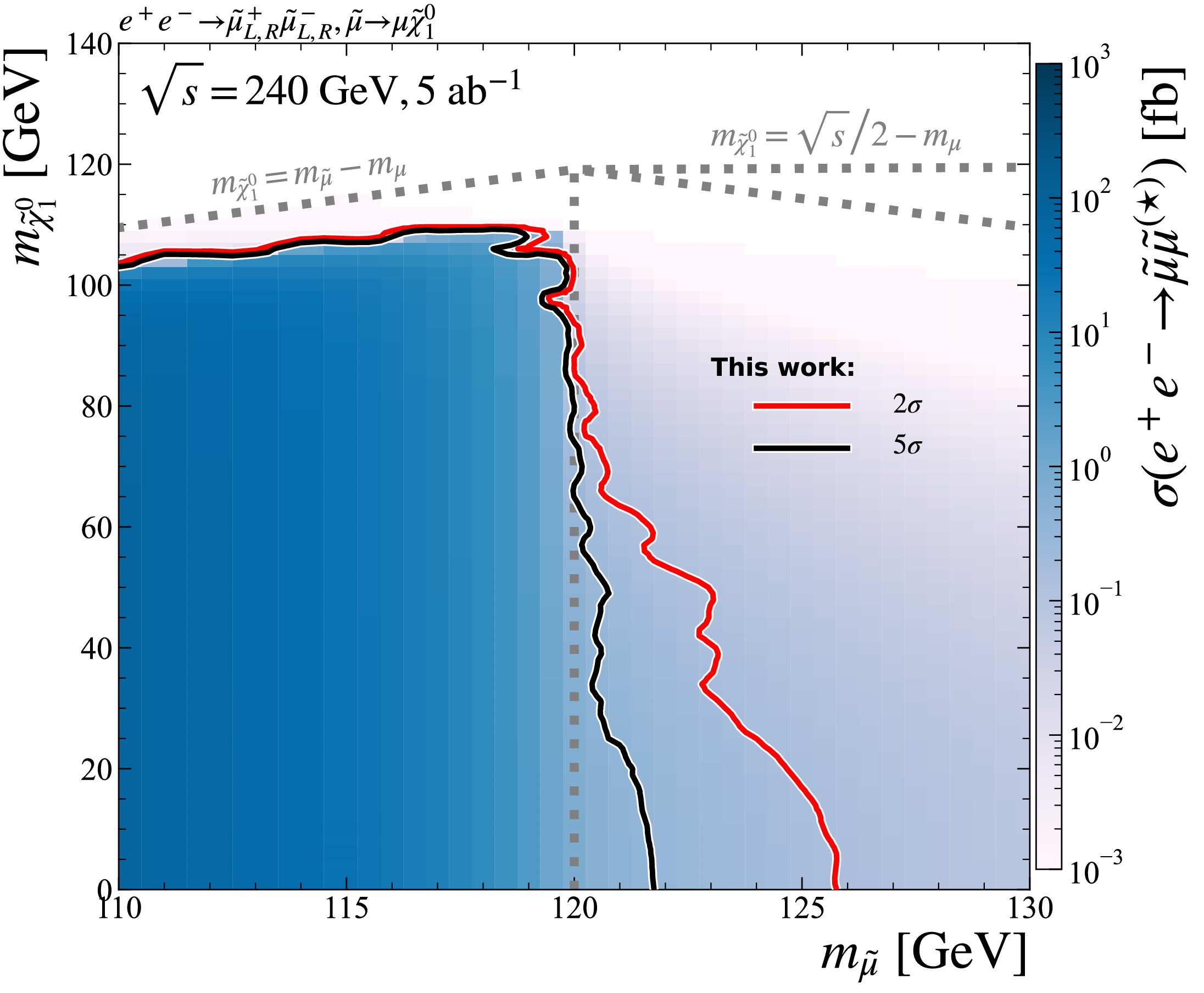 $ 3/5 \cos^2\theta_W M_1 = \sin^2\theta_W M_2 = \alpha/\alpha_s M_3 $ . All entries in$ A_u $ ,$ A_d $ and$ A_e $ are assumed to be zero except for$ (A_u)_{33} = A_{u_3} $ and$ (A_d)_{33}=A_{d_3} $ . All of the off-diagonal entries in$ m_Q^2 $ ,$ m_u^2 $ ,$ m_d^2 $ ,$ m_L^2 $ and$ m_e^2 $ to be zero, so as to suppress flavour-changing neutral currents. By setting all remaining mass matrix entries to a universal squared sfermion mass$ m_{\tilde{f}}^2 $ , the final list of free parameters contains$ M_2 $ ,$ A_{u_3} $ ,$ A_{d_3} $ ,$ m_{\tilde{f}}^2 $ ,$ m_{H_u}^2 $ ,$ m_{H_d}^2 $ and$ \tan\beta $ (plus the input scale Q and the sign of μ).Beside precise Higgs measurements at future Higgs factories, the likelihood functions include a number of direct and indirect dark matter searches, a large collection of electroweak precision and flavour observables, direct searches for supersymmetry at the LEP and Runs I and II of the LHC, and constraints from Higgs observables.