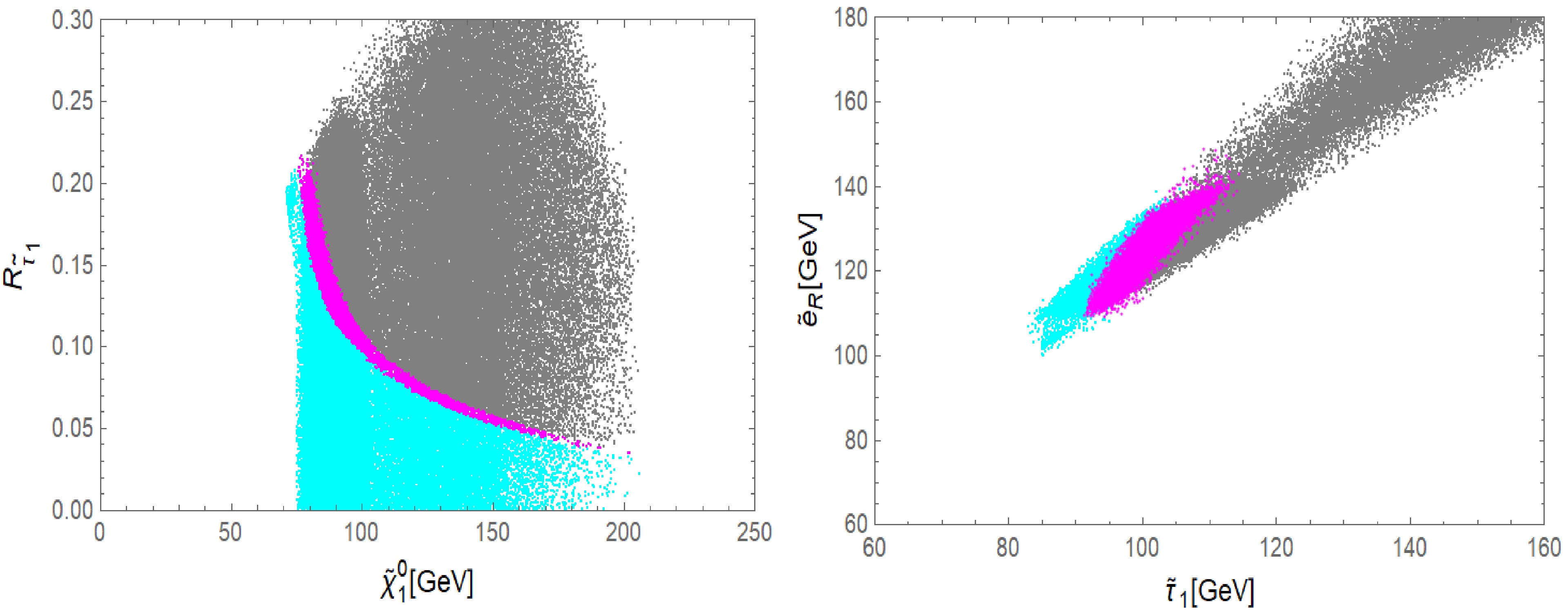 $ m_0 $ , a universal gaugino mass$ m_{1/2} $ and a universal trilinear couping$ A_0 $ . The Higgs sector has two remaining free parameters defined at the scale$ m_Z $ : the ratio of the vacuum expectation values of the two Higgs doublets,$ \tan\beta = v_u/v_d $ and the sign of μ.• NUHM1 (Non-Universal Higgs Mass 1). The GUT-scale constraint on the soft scalar Higgs masses is relaxed by introducing an additional free parameter