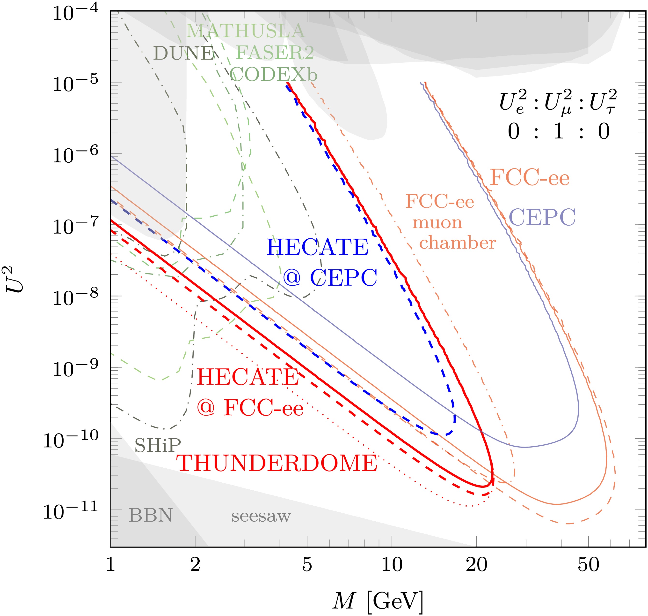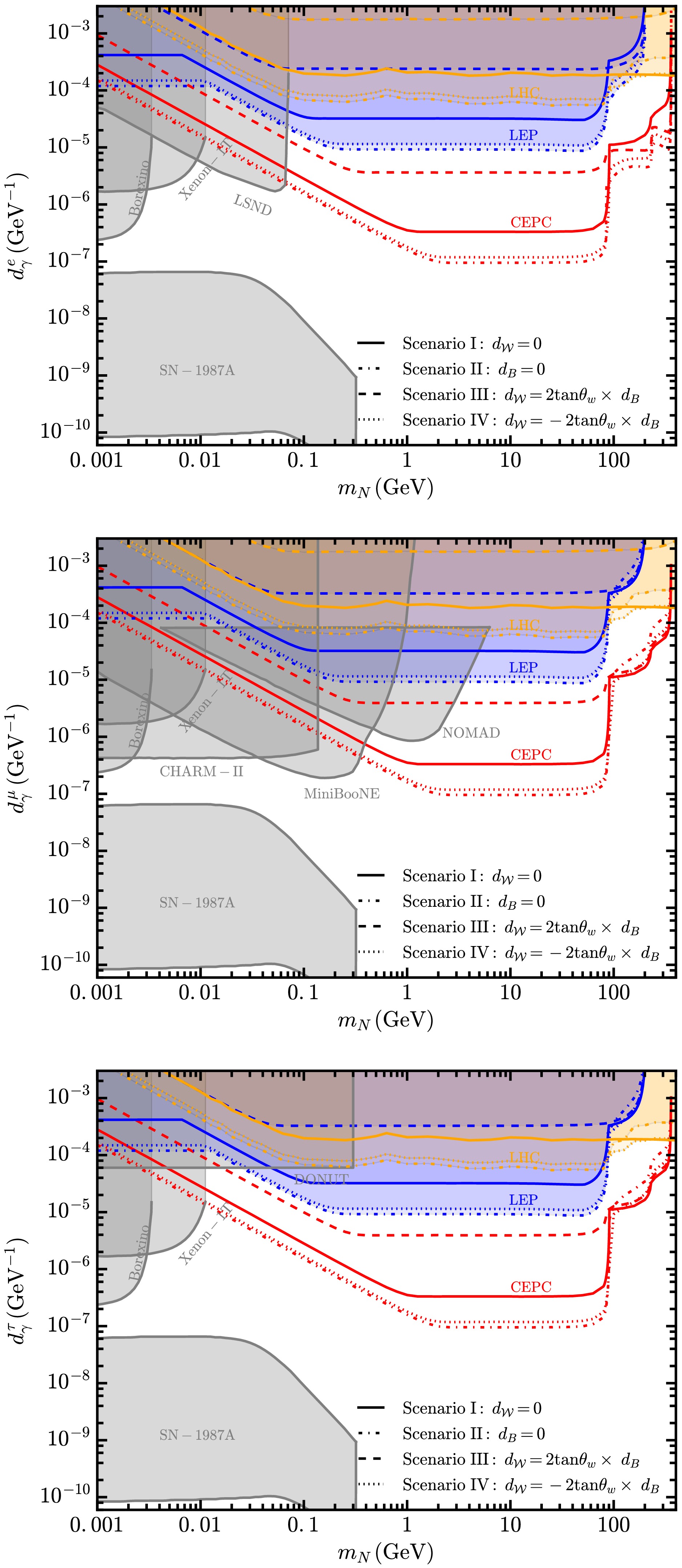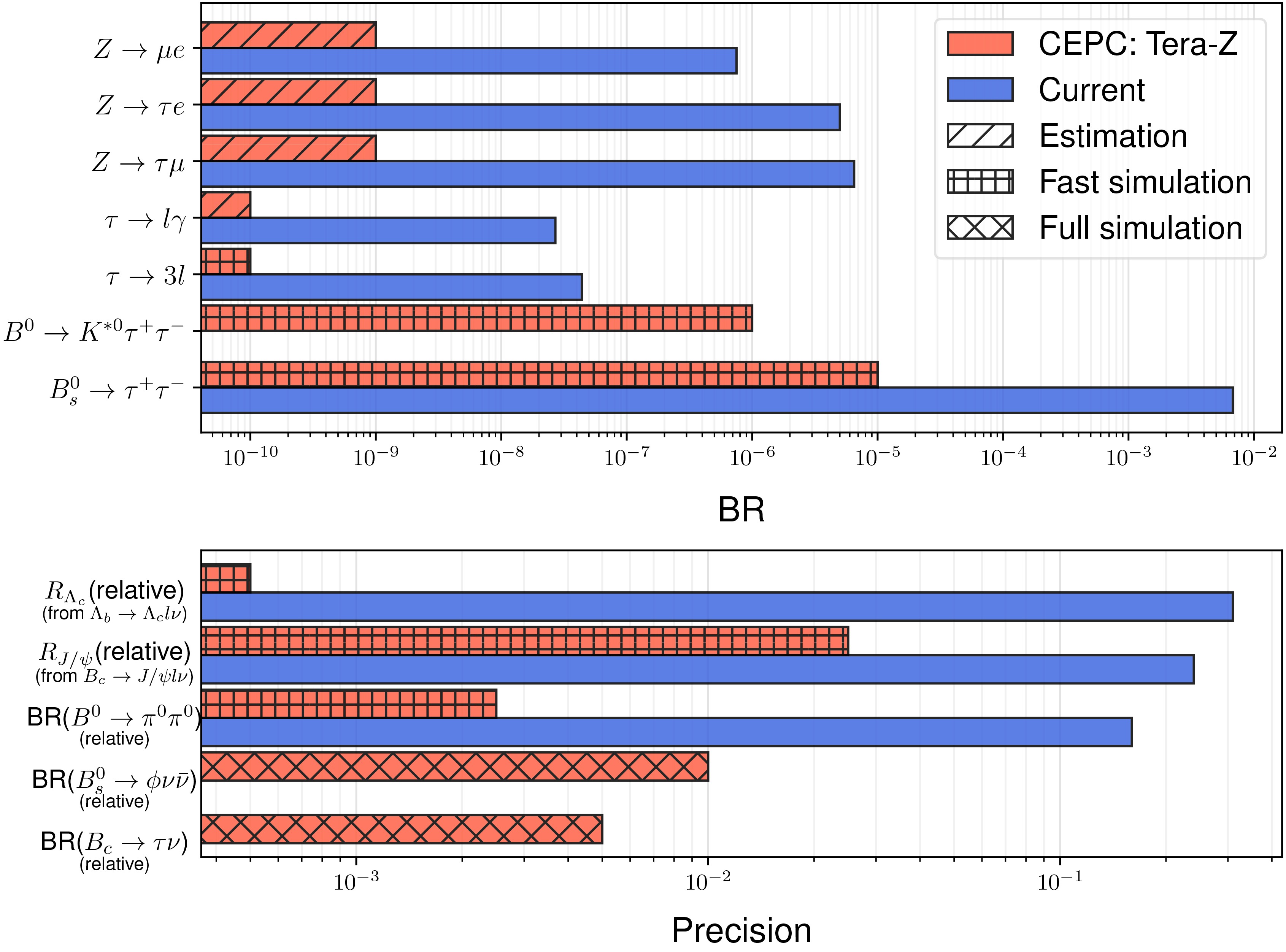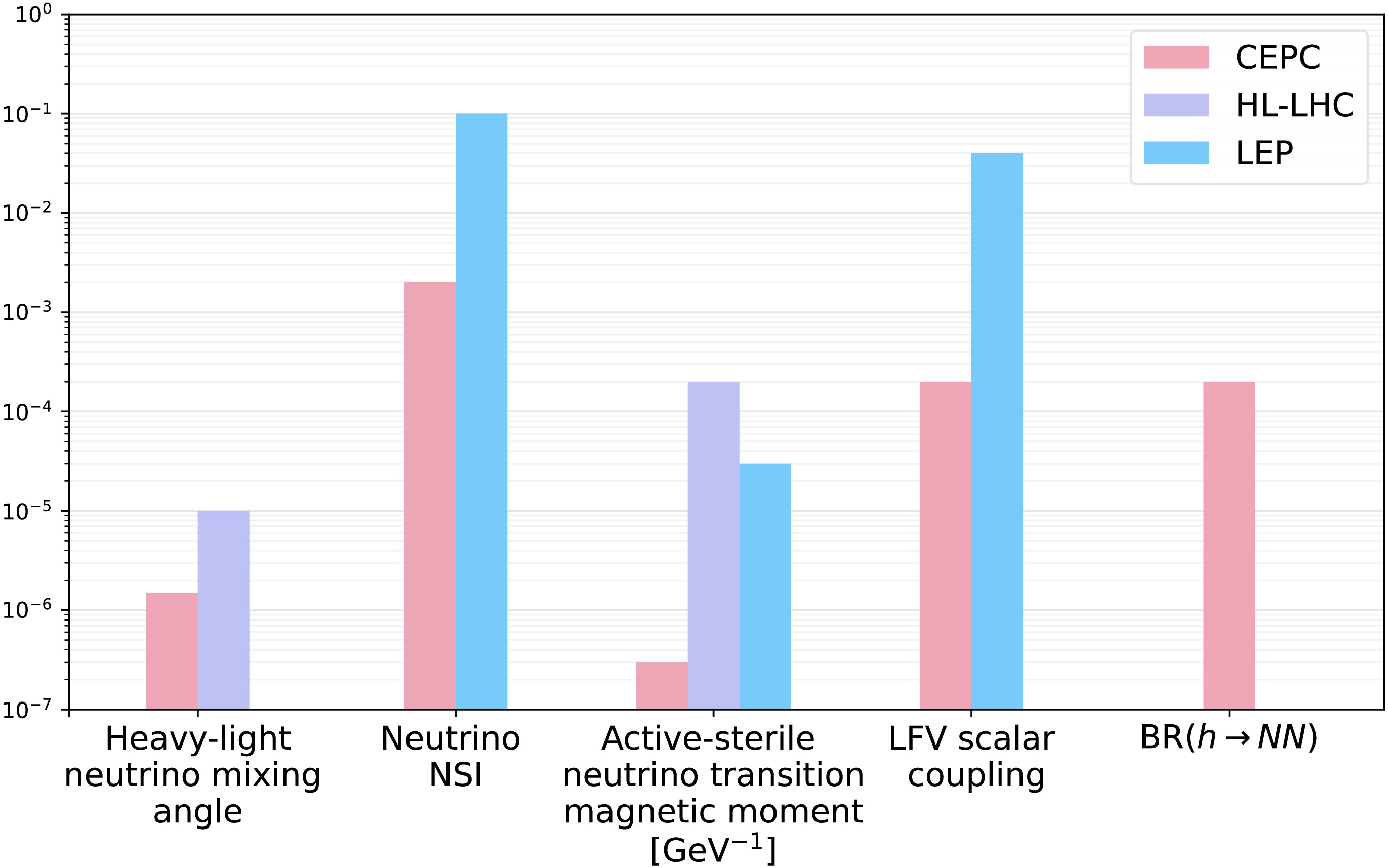 $ Z \to \ell \ell' $ . Additionally, the CEPC will allow for a highly precise examination of tau lepton charge lepton flavor violation decays, achieving sensitivity improvements of approximately two orders of magnitude. Sensitivity to rare B,$ B_s $ , and$ B_c $ meson decays via FCNC processes can also be improved by 2–3 orders of magnitude, particularly in cases where the final state involves a τ lepton. In Fig. 101, we show the branching ratio sensitivity comparison for the flavor-violating Higgs decay$ H \to sb,db $ and the B meson decays$ B_c \to \tau \nu $ and$ B_s^0 \to \phi \nu\bar{\nu} $ , where CEPC projected sensitivities are significantly better than HL-LHC and LEP experiments.Neutrino masses and oscillations require BSM physics, and the CEPC can play a significant role in exploring these phenomena. The CEPC can complement existing studies by covering parameter spaces for sterile neutrinos and non-standard neutrino interactions. With its high integrated luminosity at the Z-pole and Higgs associated production, combined with a clean experimental environment, the CEPC can achieve superior sensitivity in detecting displaced sterile neutrinos from Z and Higgs decays, surpassing the capabilities of the HL-LHC. Additionally, with potential main detector setups and far detector options, the CEPC could further enhance its reach. In Fig. 101, the transition dipole operator for sterile neutrinos, particularly for masses above the GeV scale, and the active neutrino mixing can be the most effectively probed at CEPC, providing sensitivity improvements by three and one orders of magnitude respectively compared to HL-LHC.