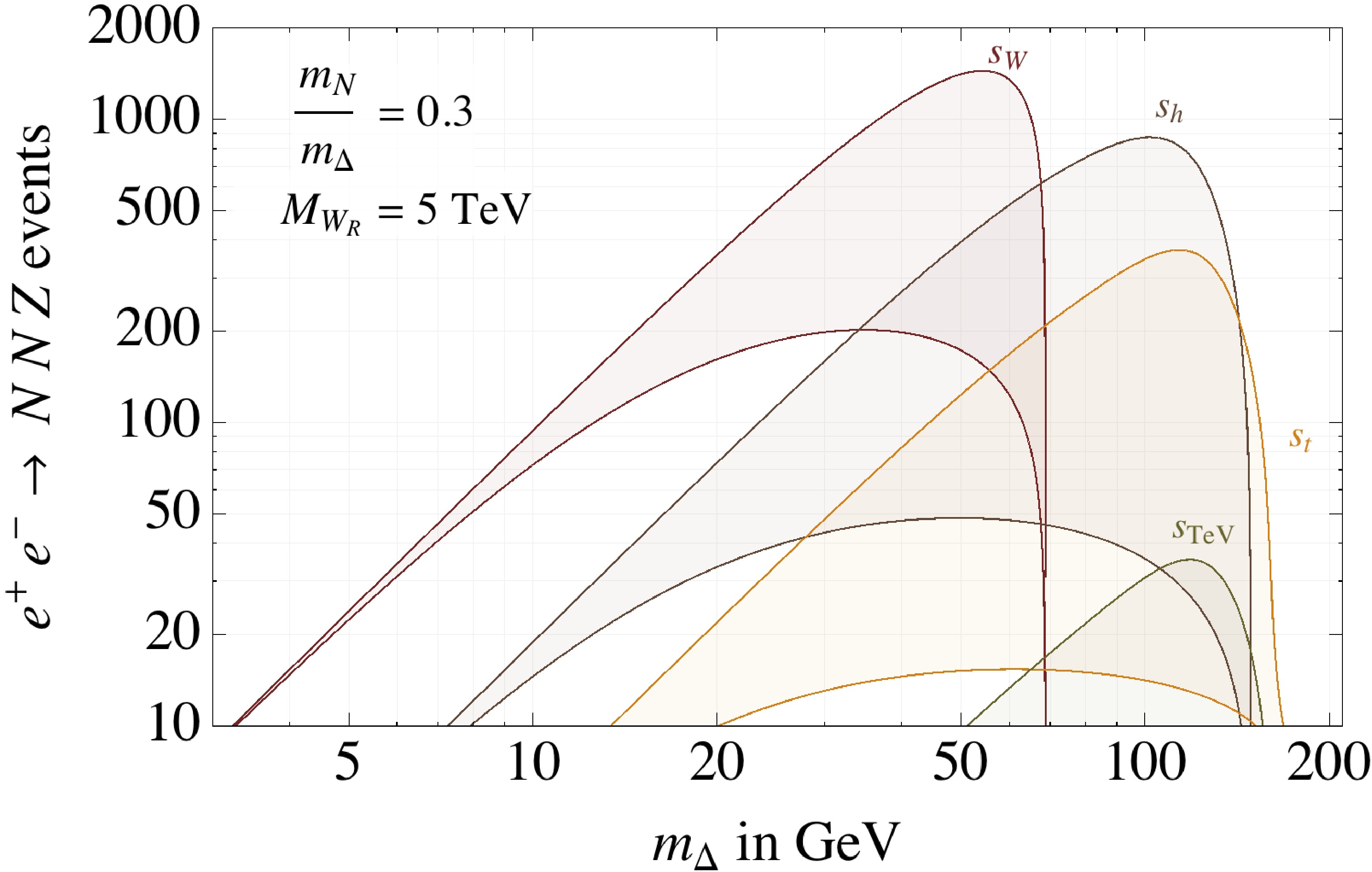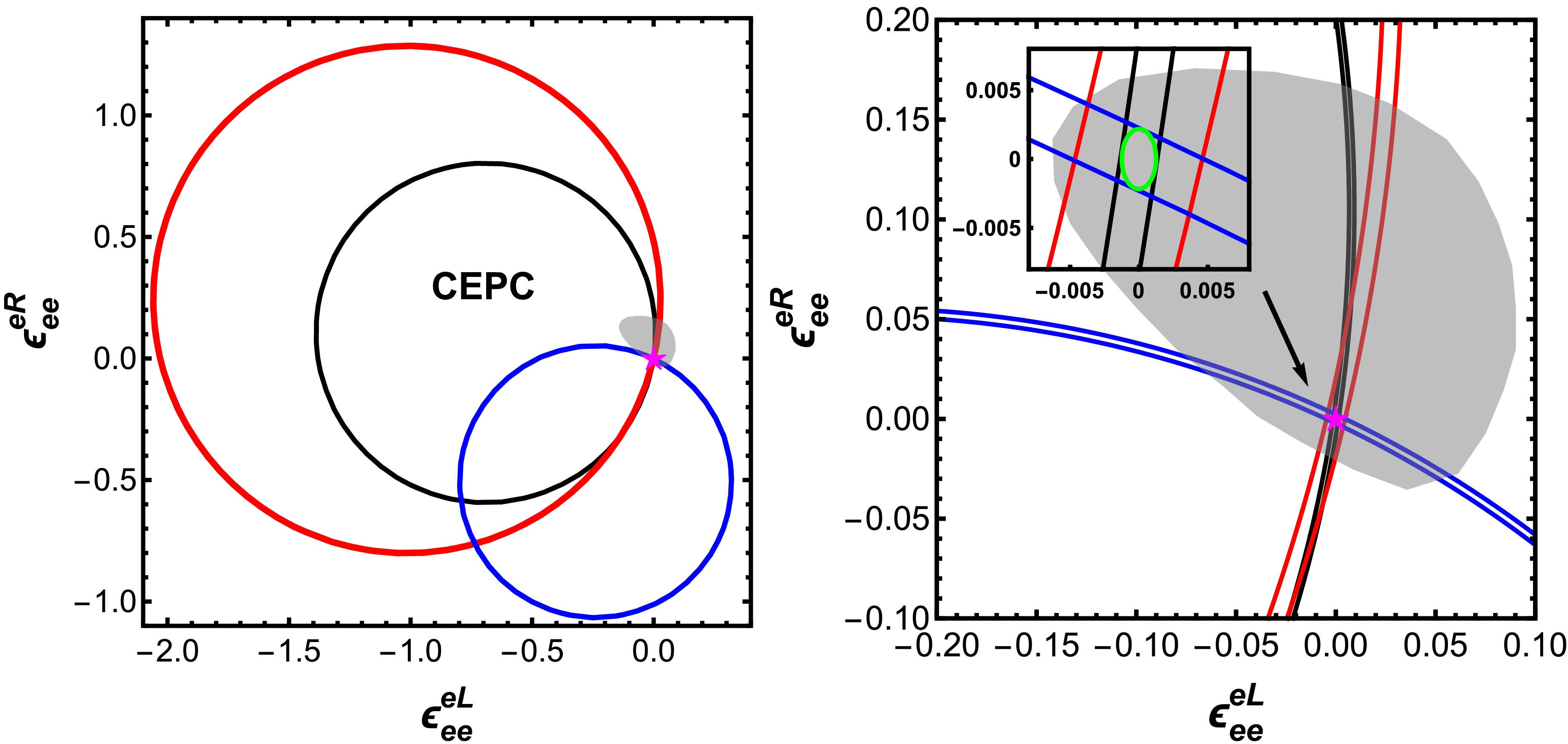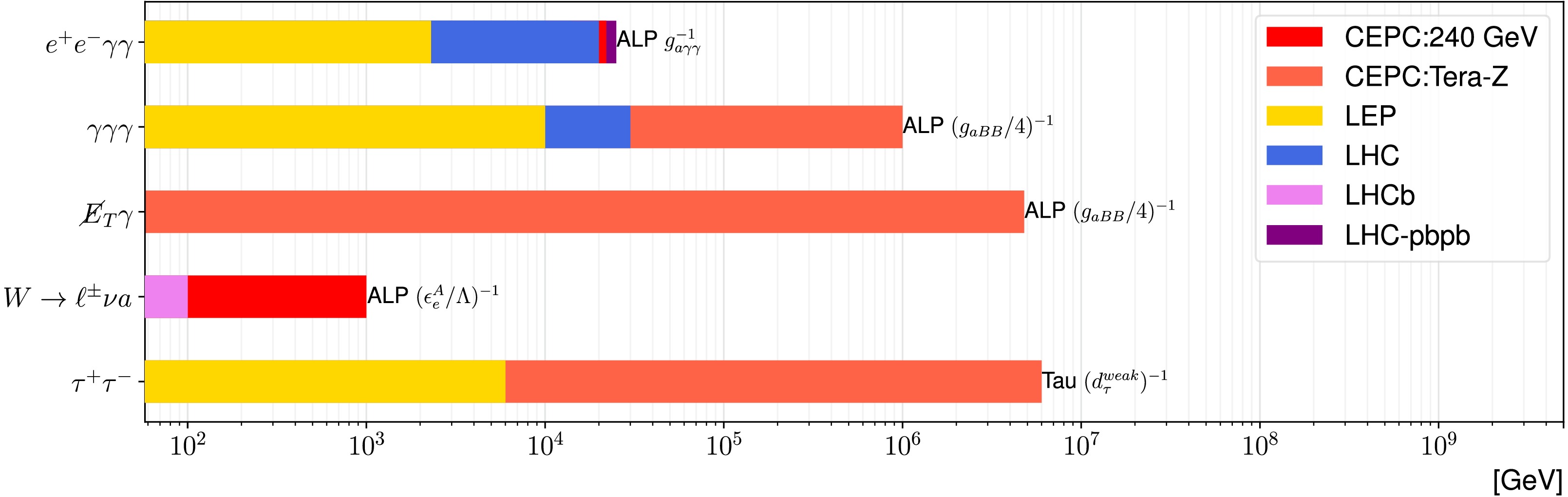Figure 102. (color online) The typical energy scale of New Physics that could be probed at the CEPC. The left column corresponds to a specialized New Physics Model of SUSY, and exotic New Physics signal searches, including Axion-like particles, and scalar particles in seesaw Models. The middle and right columns correspond to New Physics search via EFT.
