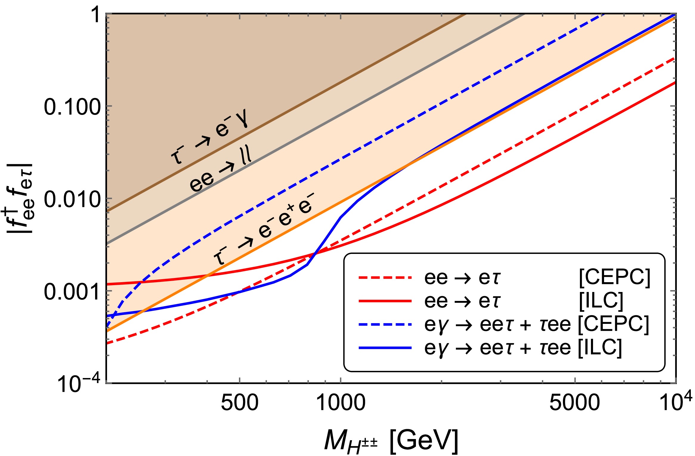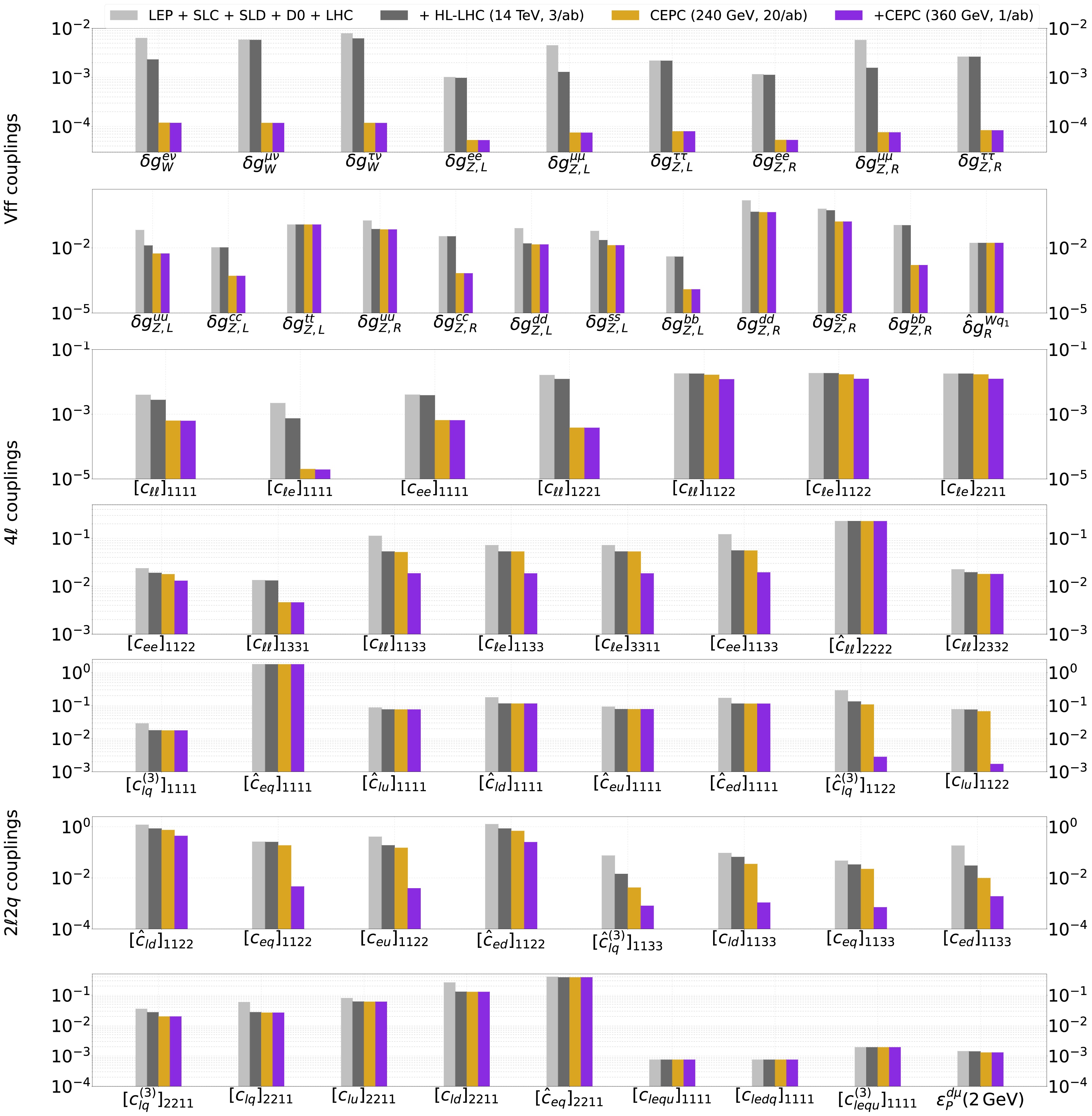 $ 4\ell $ "), semileptonic four-fermion operator induced physics ("$ 2\ell2q $ "), and Higgs physics ("Higgs"). -