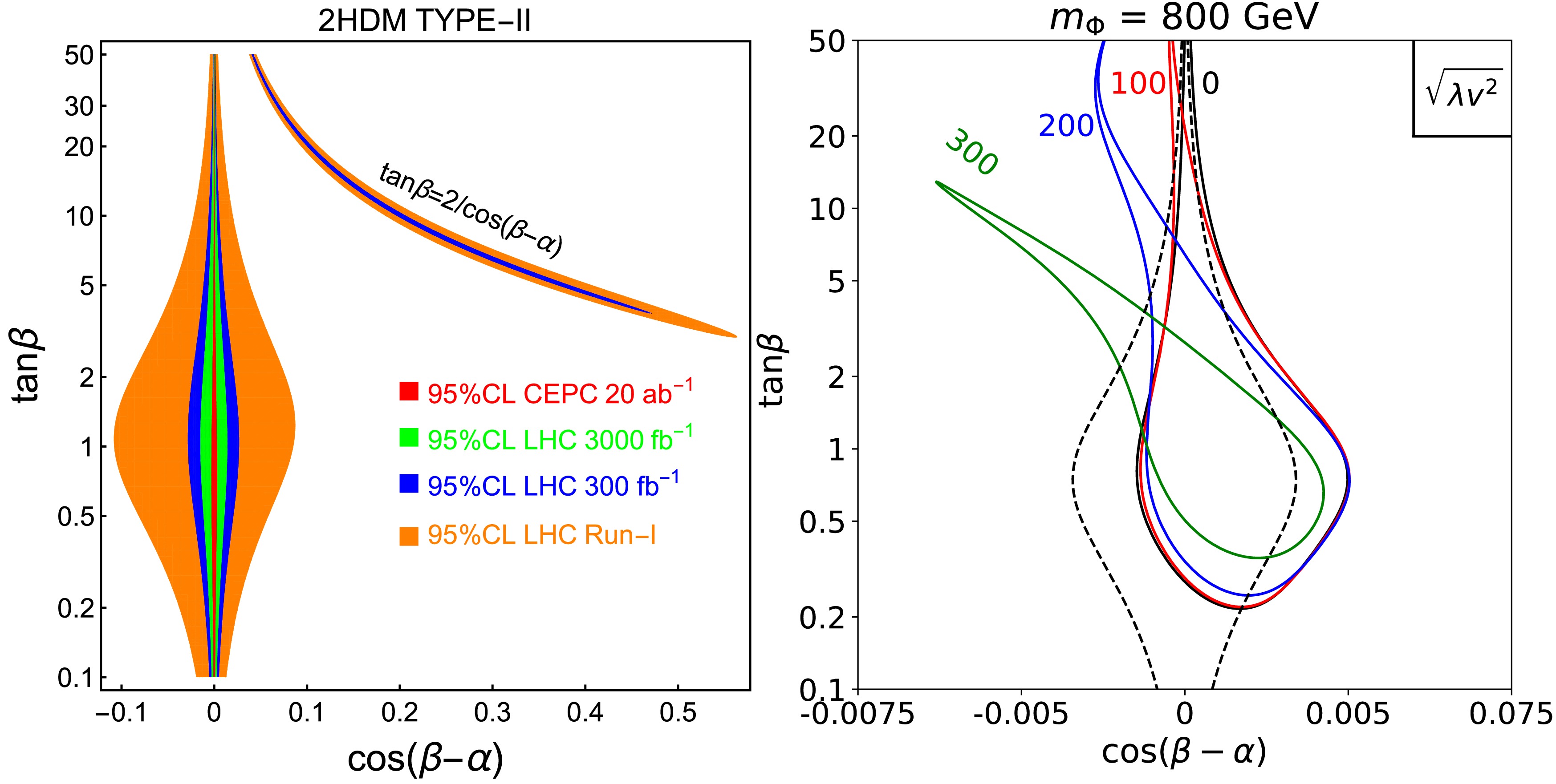 $ \cos(\beta-\alpha) $ -$ \tan \beta $ at 95% C.L. for the Type-II of 2HDM, given LHC and CEPC Higgs precision measurements at tree level (left) and loop level under CEPC (right). For the tree-left global fit, the special "arm" regions for the Type-II is the wrong-sign Yukawa region. The right panel shows the parameter space varying the value$ \sqrt{\lambda v^2} $ with$ m_A=m_H=m_{H^\pm}=m_\Phi=800 $ GeV. The tree-level only global fit results are shown by the dashed black lines for comparison. More details are shown in Ref. [598].To fully explore the Higgs factory potential in search for new physics beyond the SM, both the tree-level deviation and loop corrections need to be considered. The right panel of Figure 98 shows the 95% C.L. global fit results to all CEPC Higgs rate measurements in the Type-II 2HDM parameter space, including both tree level and loop corrections. Degenerate Heavy Higgs masses