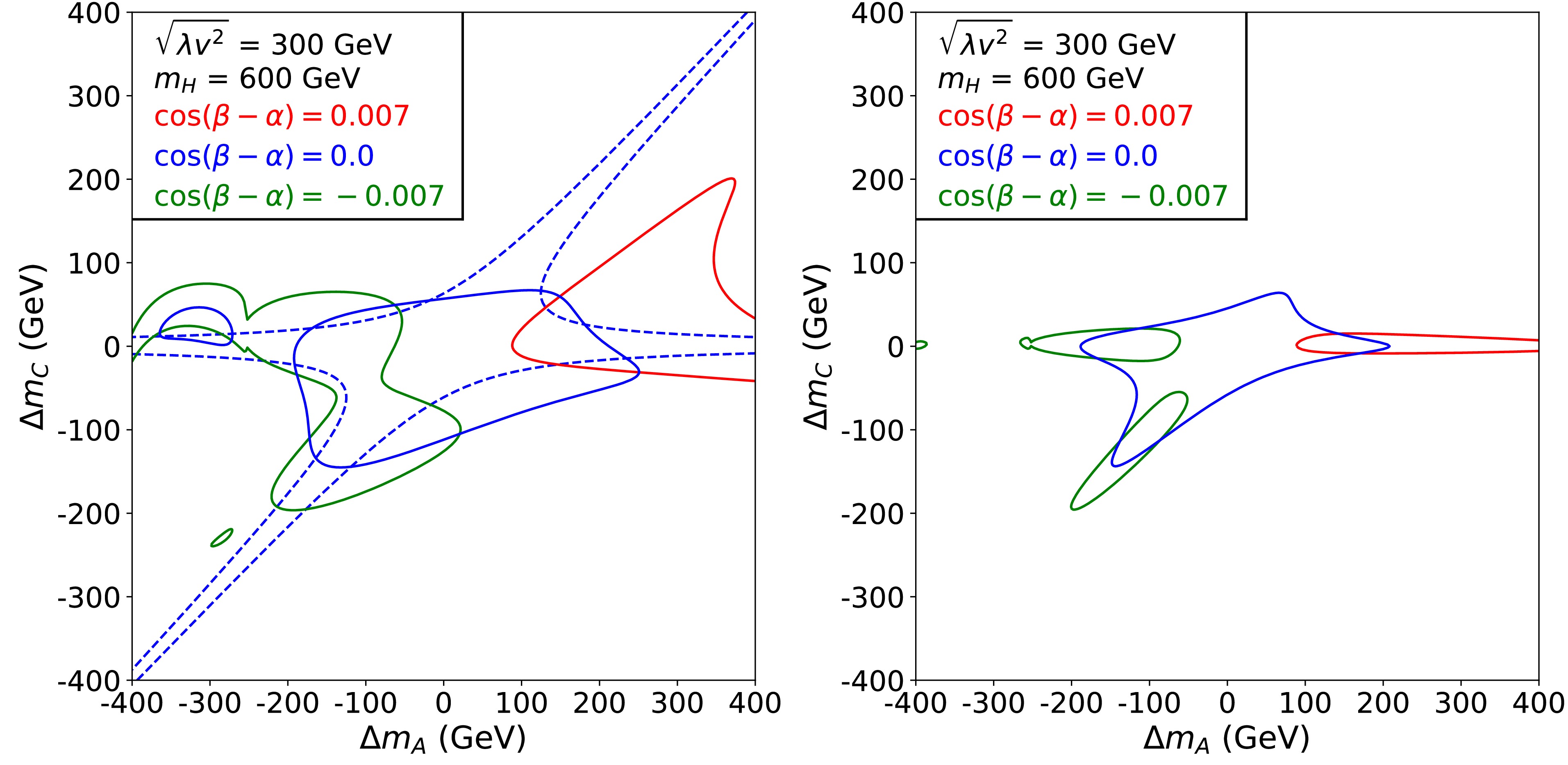 $ m_A=m_H=m_{H^\pm}=m_\Phi $ are assumed such that Z-pole precision measurements are automatically satisfied. Black, red, blue and green curves are for model parameter$ \sqrt{\lambda v^2}=\sqrt{m_\Phi^2-m_{12}^2/s_\beta c_\beta}=0 $ , 100,200, and 300 GeV, respectively. The tree-level only global fit results are shown by the dashed black lines for comparison.$ |\cos(\beta-\alpha)| $ is typically constrained to be less than about 0.008 for$ \tan\beta\sim 1 $ . For smaller and larger values of$ \tan\beta $ , the allowed range of$ \cos(\beta-\alpha) $ is greatly reduced. Loop effects from heavy Higgses tilt the value of$ \cos(\beta-\alpha) $ towards negative, especially in the large$ \tan\beta $ region.Going beyond the degenerate mass case, both the Higgs and Z-pole precision variables are sensitive to the mass splittings between the charged Higgs and the neutral ones. Figure 99 shows the 95% C.L. range of