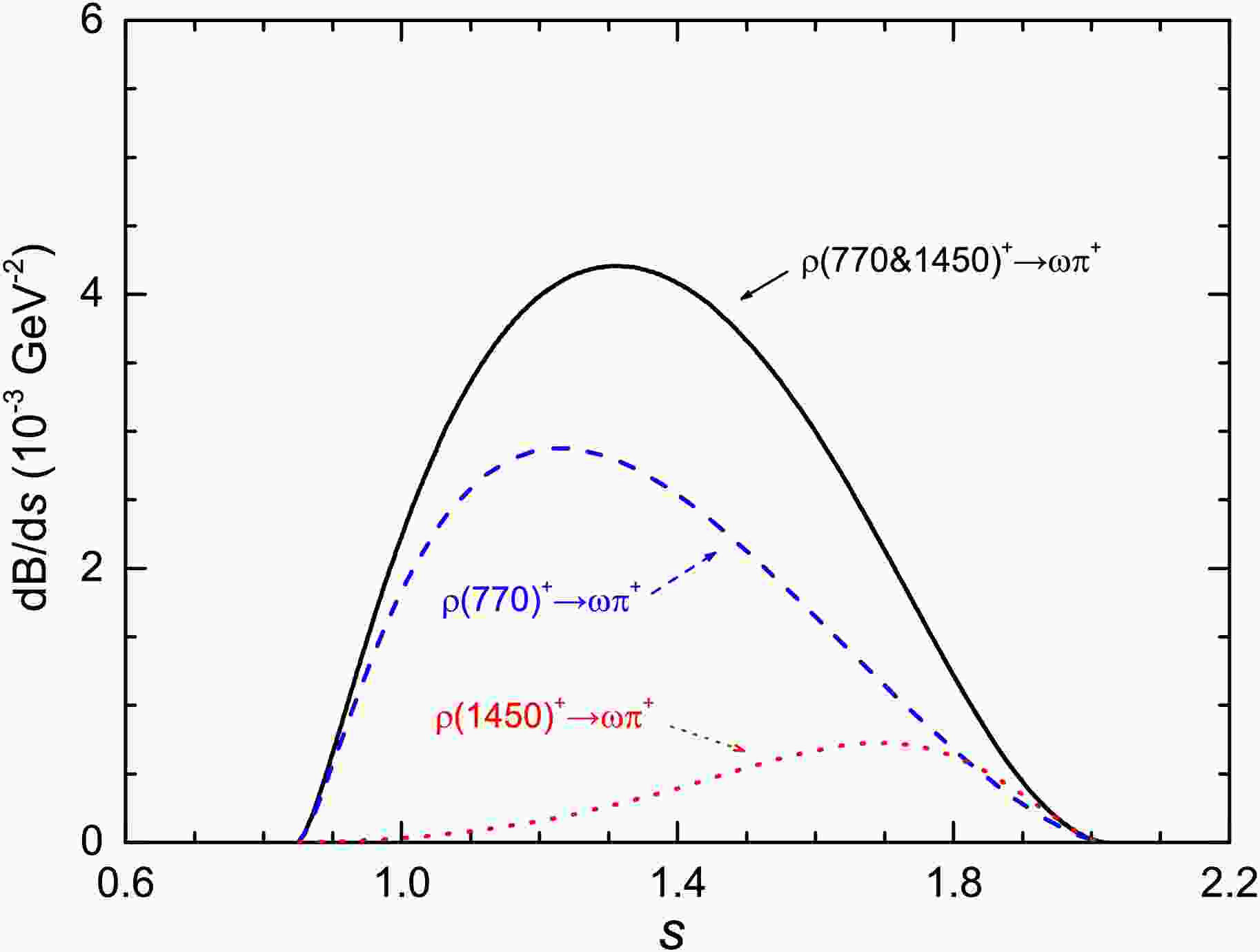 $ \Gamma_{\rho(770)}(s) $ , we employ the expression$ \begin{aligned}[b] \Gamma_{\rho(1450)}(s) =\Gamma_{\rho(1450)} \Bigl[ {\mathcal B}_{\rho(1450) \to \omega\pi} \Bigl(\frac {q_{\omega}(s)} {q_{\omega}(m^2_{\rho(1450)})}\Bigr)^3 \end{aligned} $