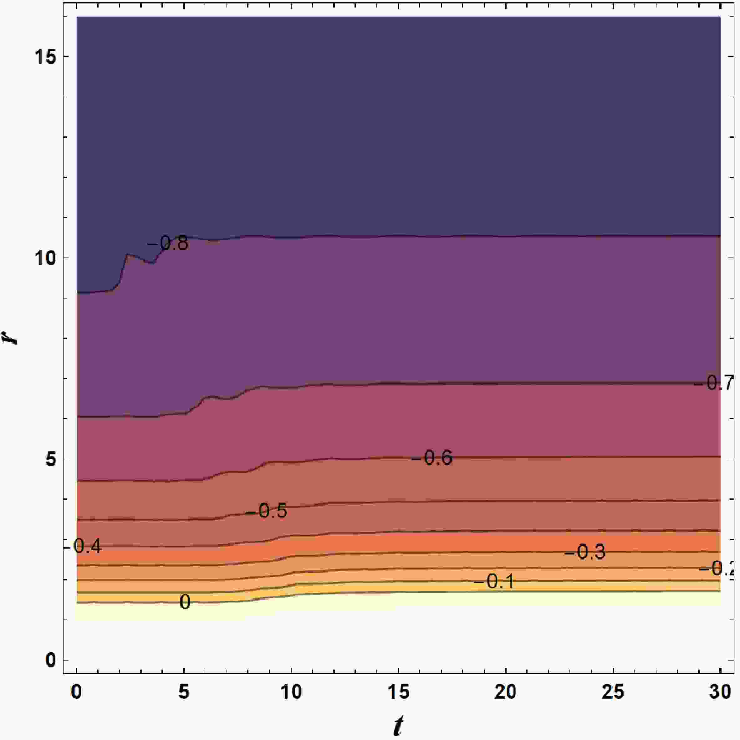 $ g_{tt} $ as a function of time t and radial coordinate r. This parameter asymptotically approaches$ -1 $ as$ r\rightarrow \infty $ . The contour line of$ g_{tt}=0 $ corresponds to the position of the apparent horizon$ r_{\rm h} $ .