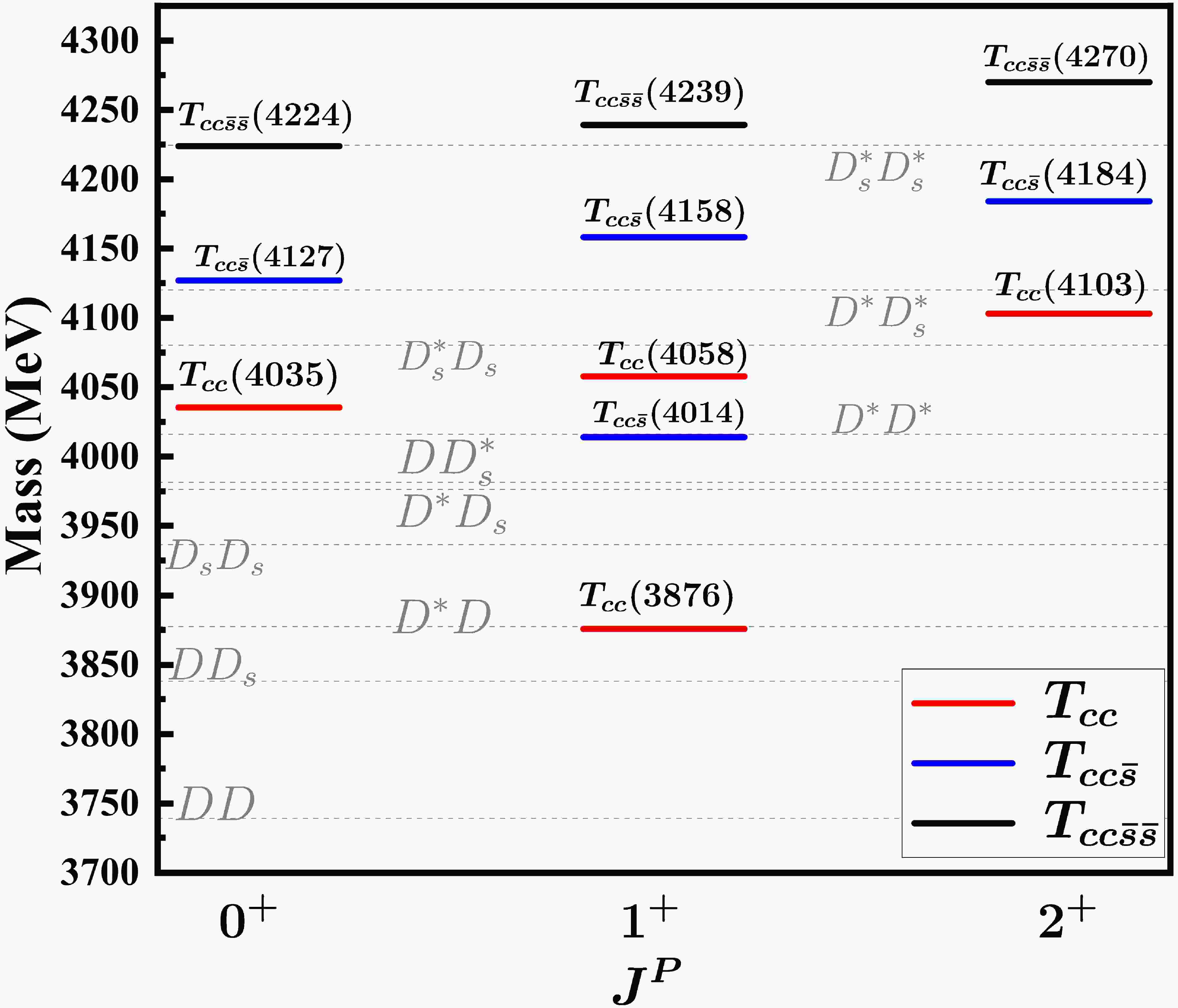 Figure 1. Mass spectrum and spin-parity of doubly charmed tetraquarks with nonstrange (red), single-strange (blue) and double-strange quarks (black).